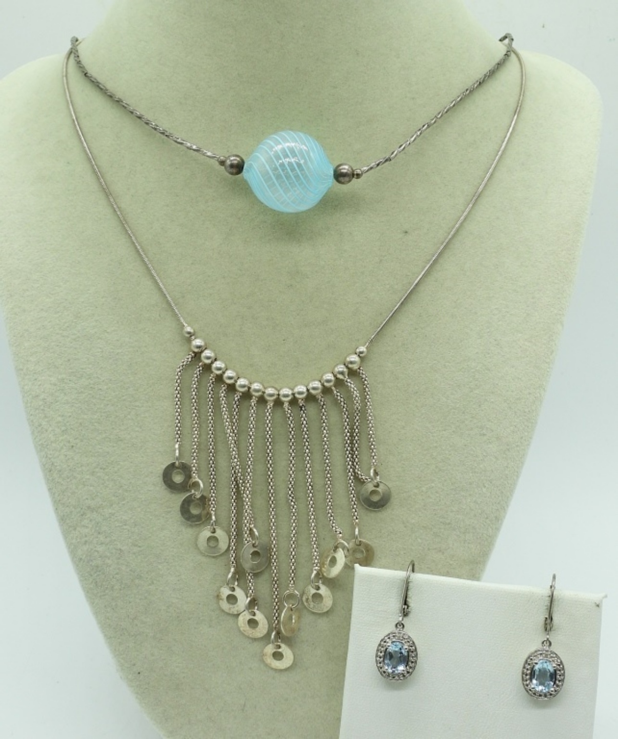 1 BLOWN GLASS PENDANTS ON A STERLING 19″ CHAIN. 17″ NECKLACE. PIERCED EARRINGS. 13.5 DWT