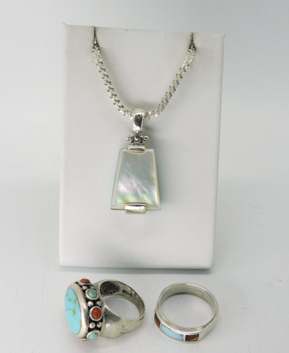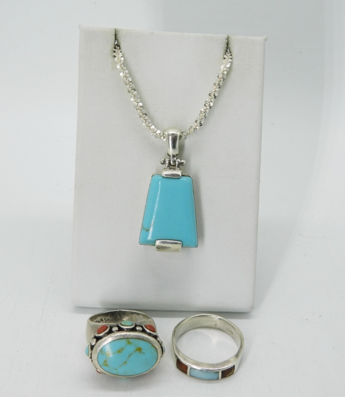 TWO SOUTHWEST STYLE STERLING RINGS, ONE IS BENT (SEE PHOTOS). SIZES 7 & 9. STERLING 19″ CHAIN WITH SOUTHWEST STYLE PENDANT. 22.1 DWT