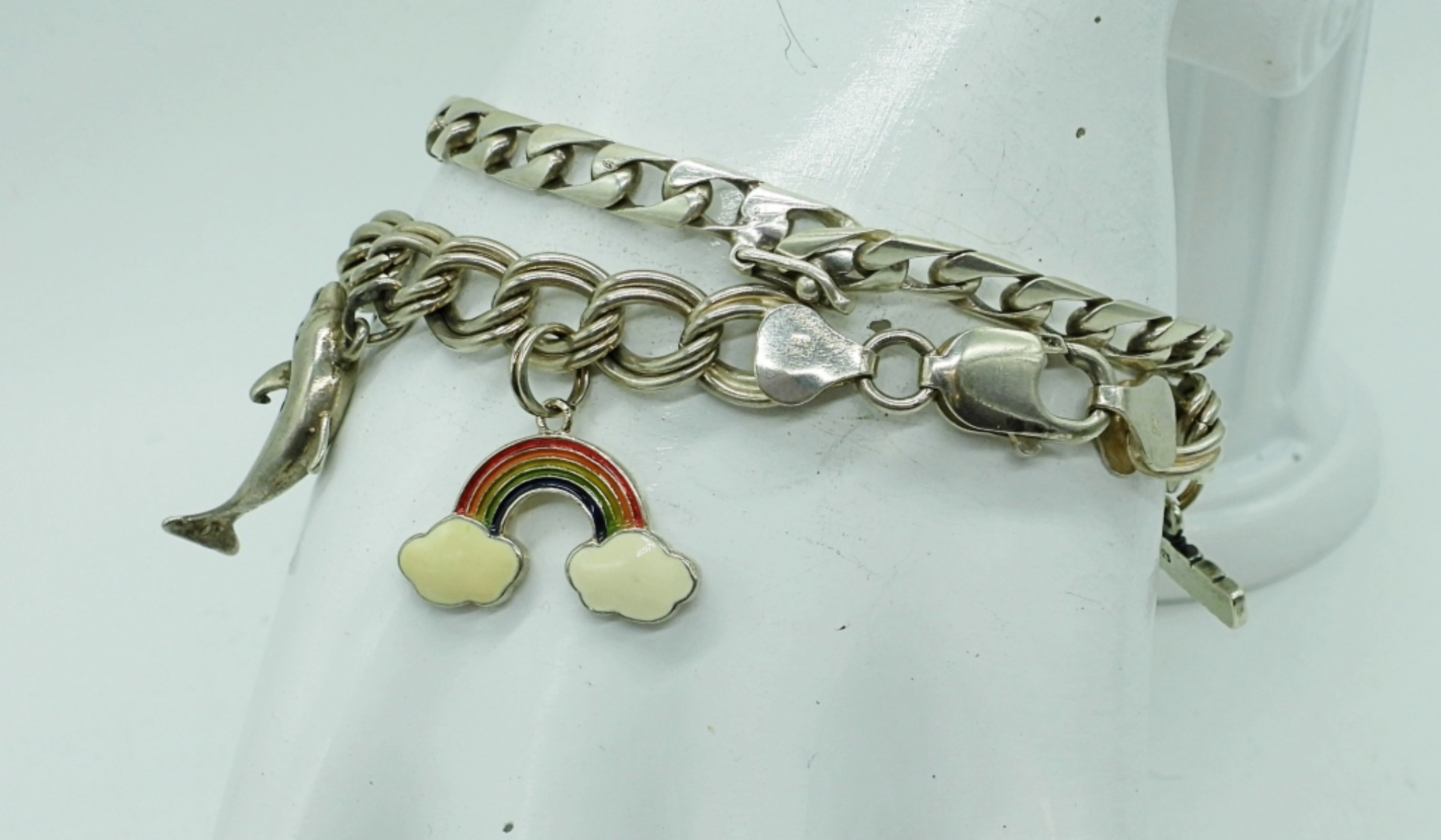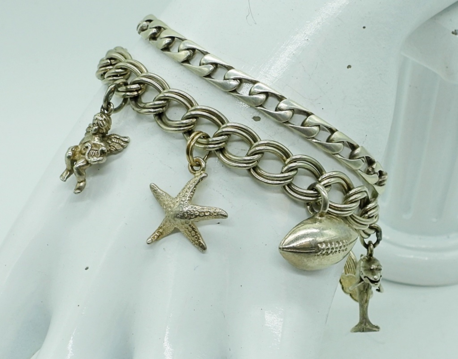 ONE STERLING CHARM BRACELET WITH 7 CHARMS, 7″. STERLING CHAIN BRACELET, 7″. 23.2 DWT