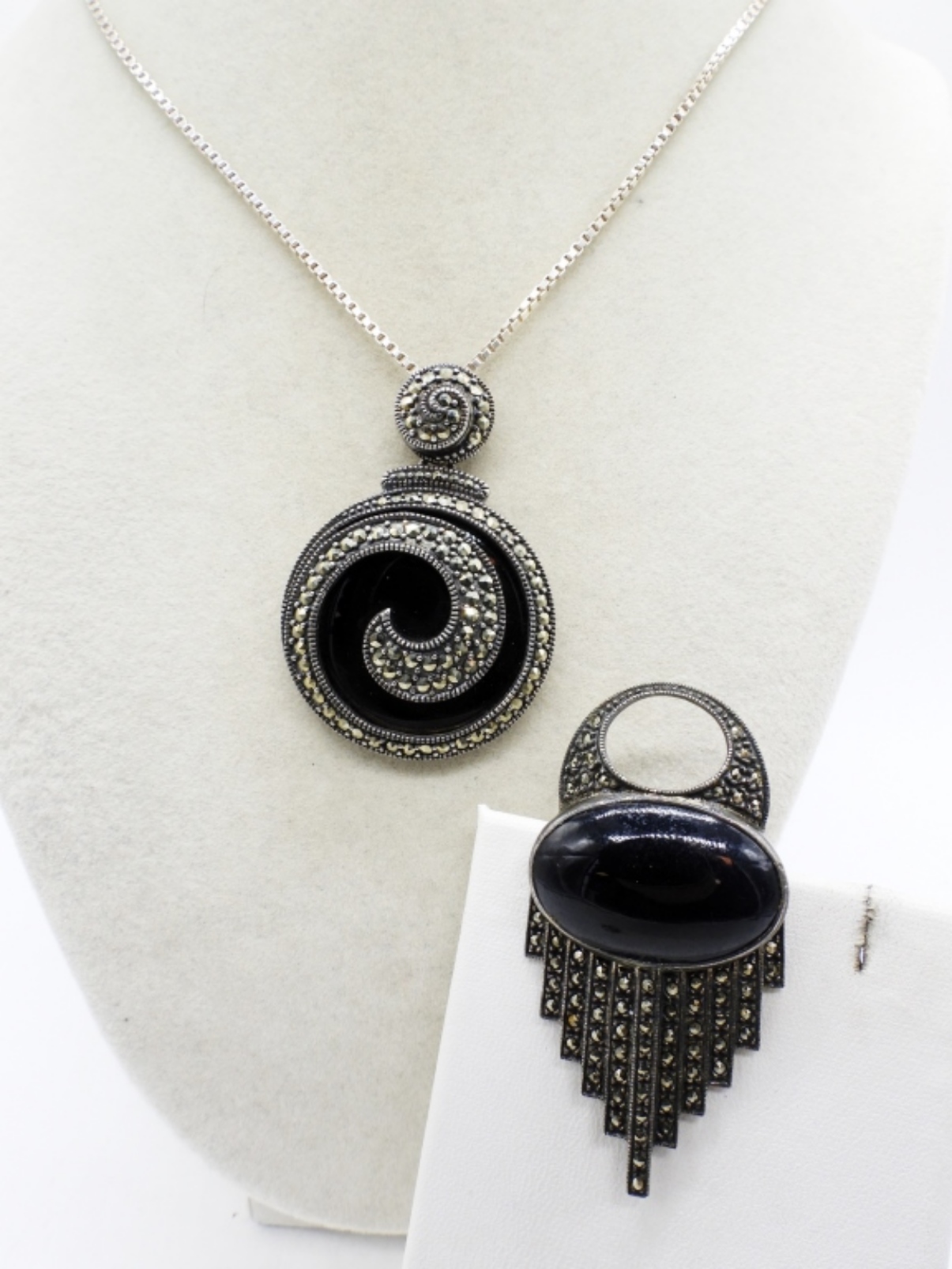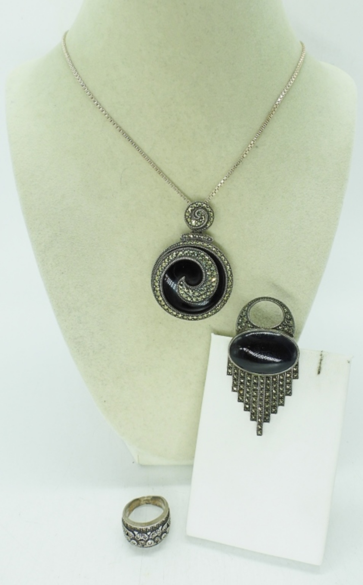 NECKLACE 36″. BROOCH, 2.5″. RING (SLIGHTLY MISSHAPEN) SIZE 7. 32.7 DWT