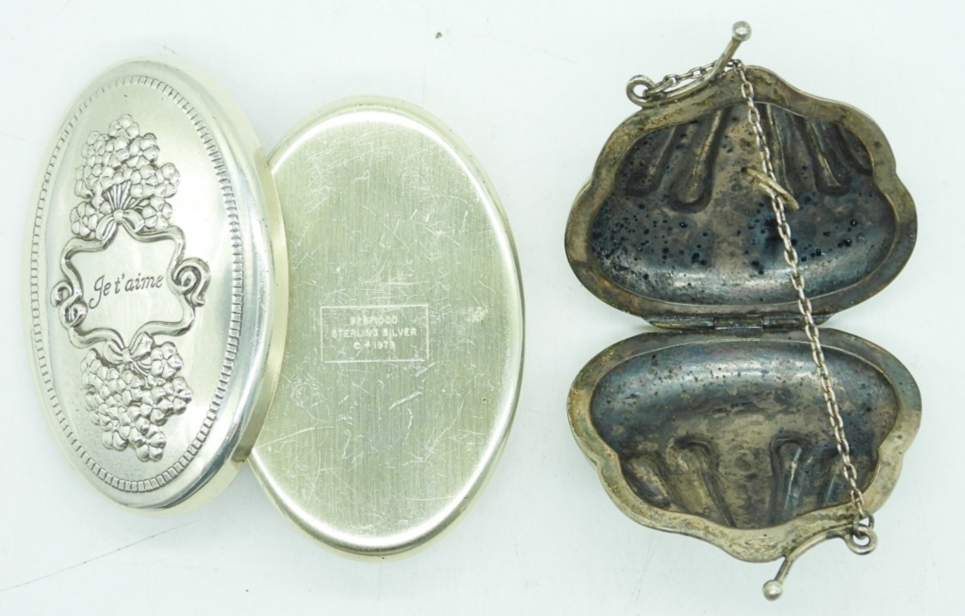 TWO STERLING TRINKET BOXES. OVAL BOX MEASURES 2″x1″. STERLING PURSE SHAPED PILL BOX, 2″. 25.7 DWT