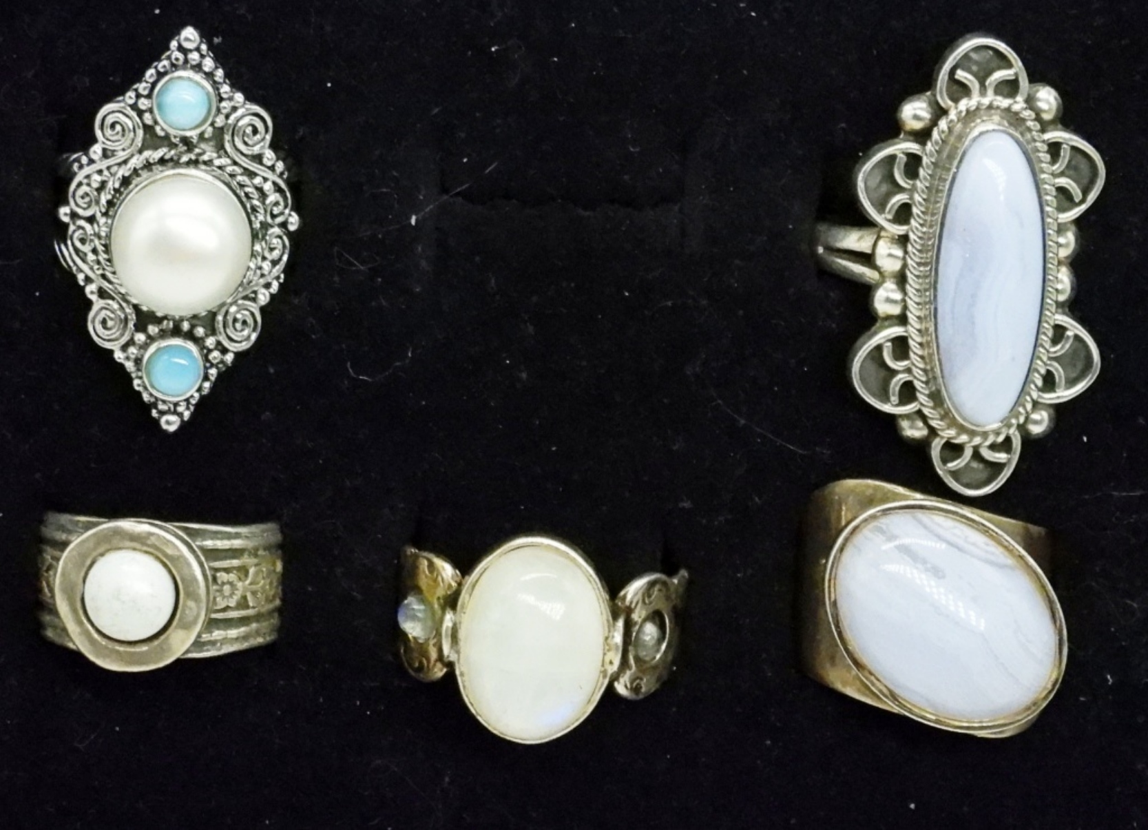 FIVE STERLING LIGHT GEMSTONE RINGS, SIZES 6, 8, 9, 10. 27.7 DWT