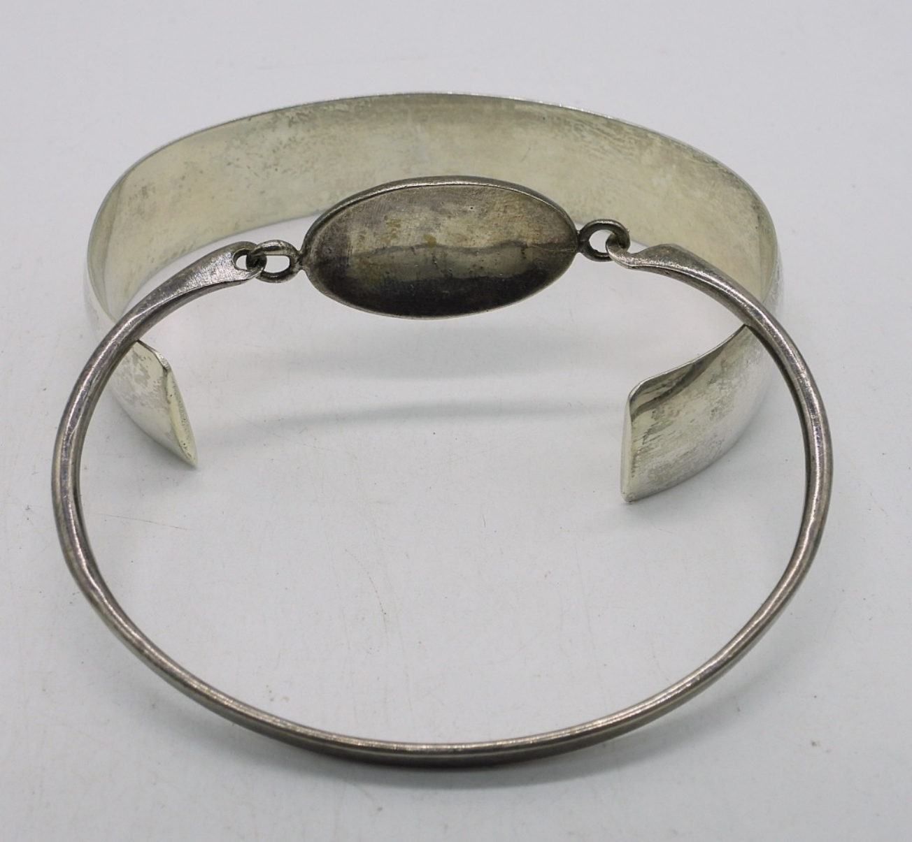 TWO STERLING BANGLE BRACELETS, SOME TARNISHING. 8″. 32.8 DWT