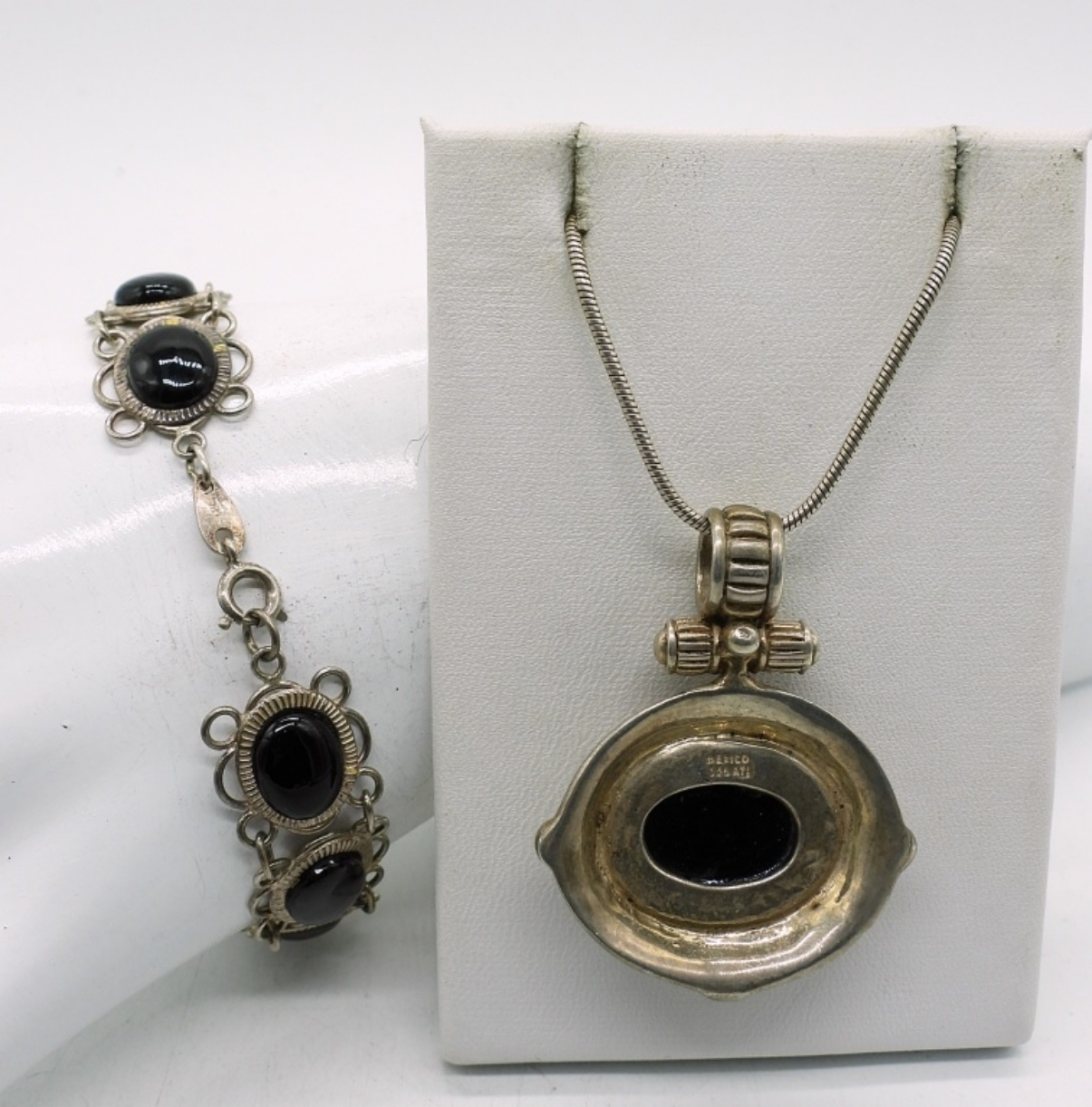 STERLING BLACK ONYX “MEXICO 925″ PENDANT ON A 16″ CHAIN. STERLING BLACK ONYX BRACELET 7”, MISSING 2 STONES BUT THEY ARE IN THE BAG! 21.7 DWT