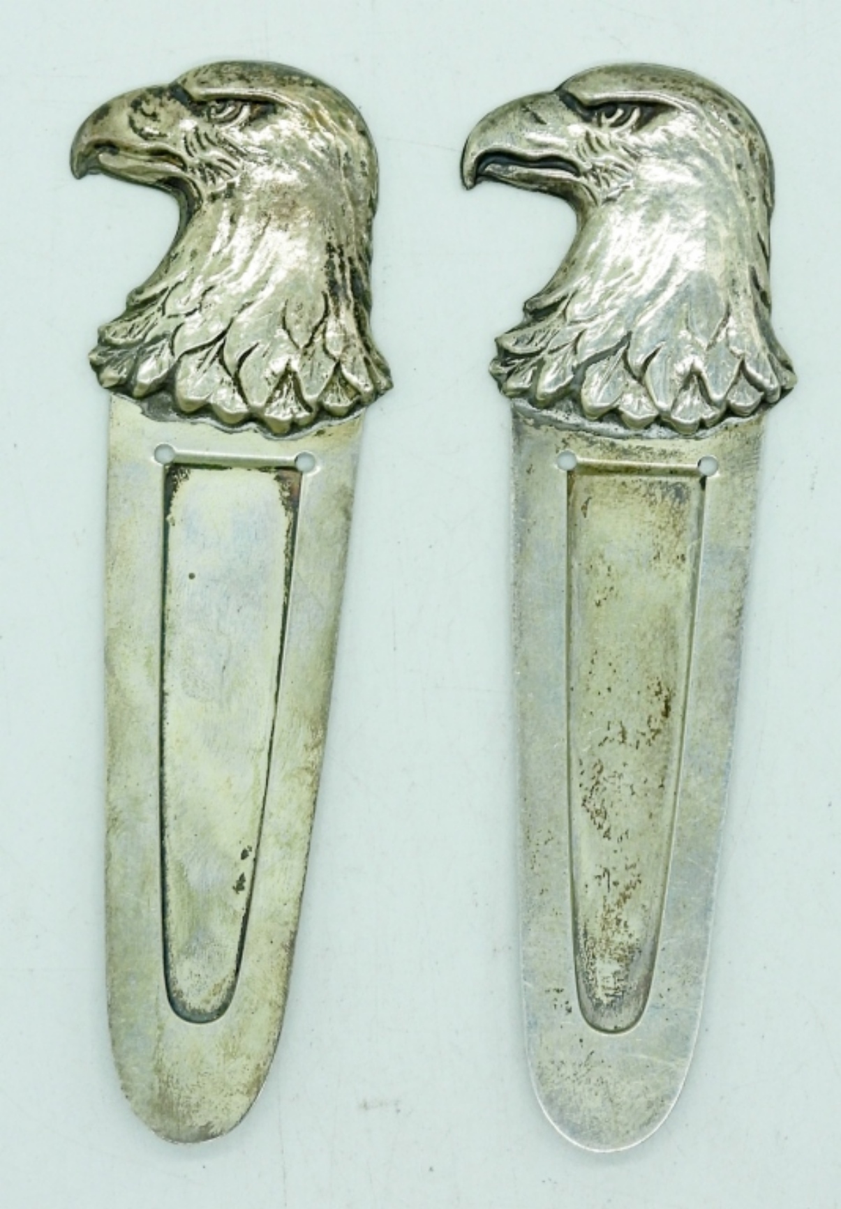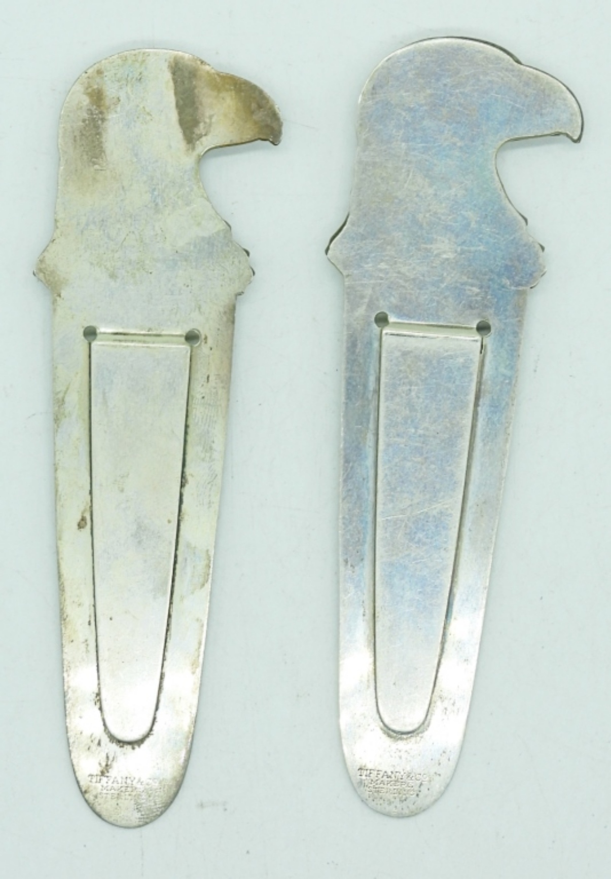 TWO TIFFANY & CO MAKERS, STERLING SILVER EAGLE HEAD BOOKMARKS. 3.5″ LONG. 18.7 DWT