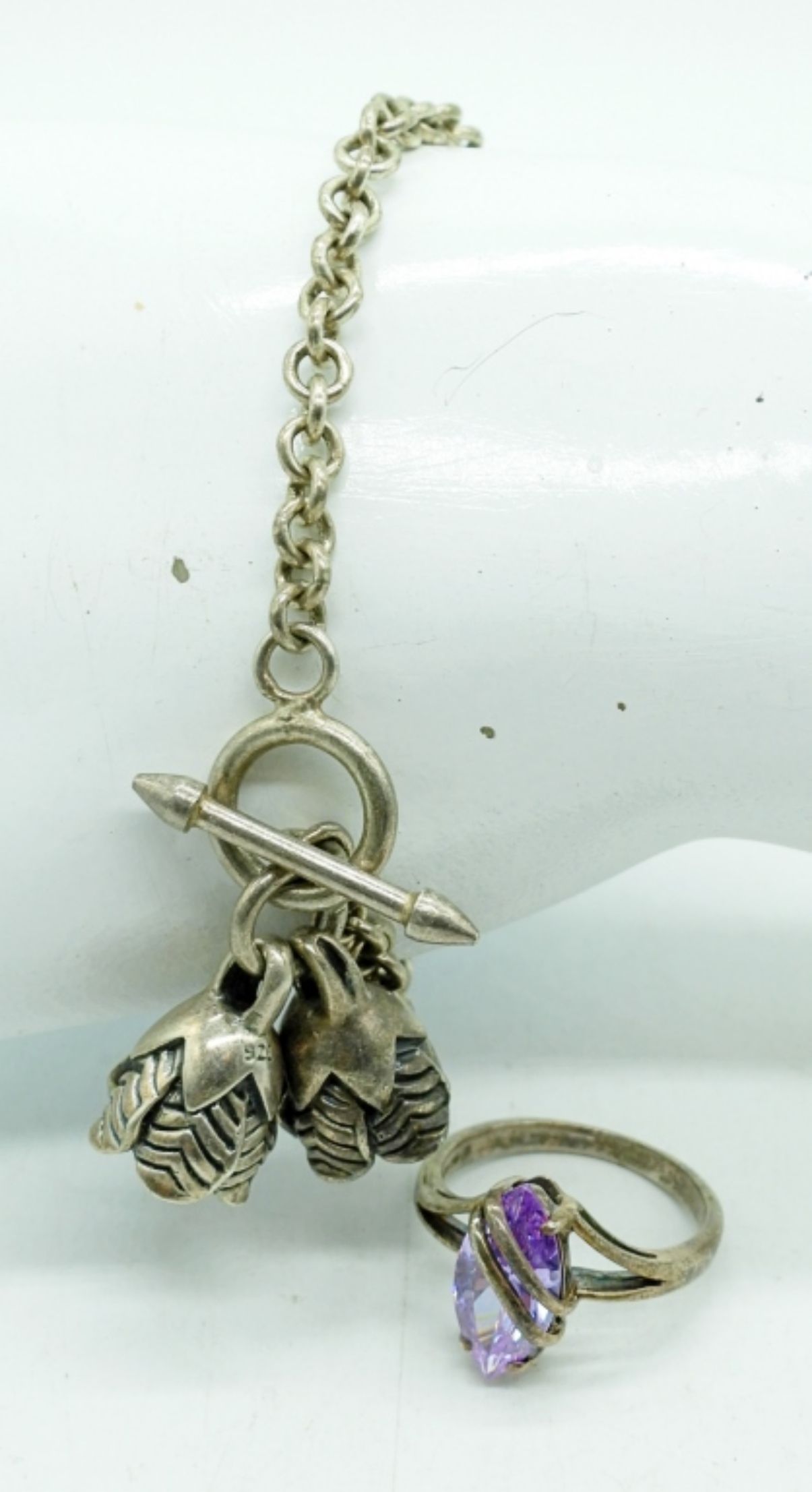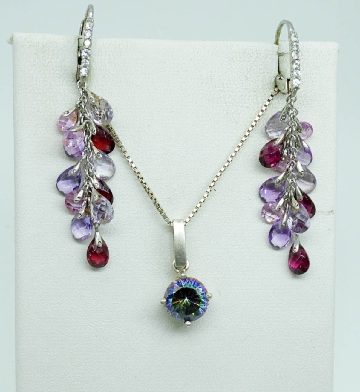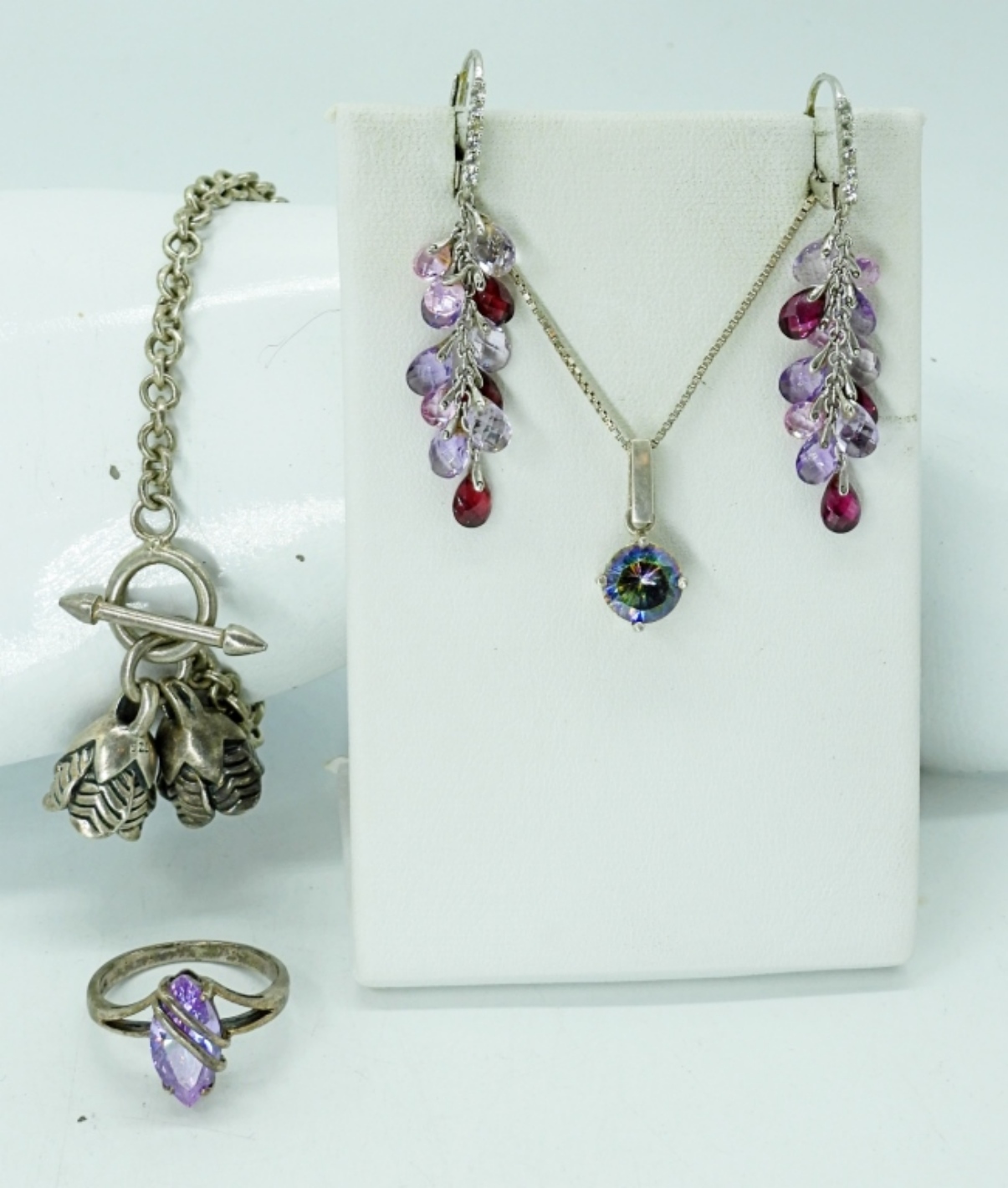 AMETHYST STERLING RING SIZE 7. MYSTIC TOPAZ STERLING NECKLACE, 20″. PIERCED EARRINGS. STERLING BRACELET 7″. 16.9 DWT