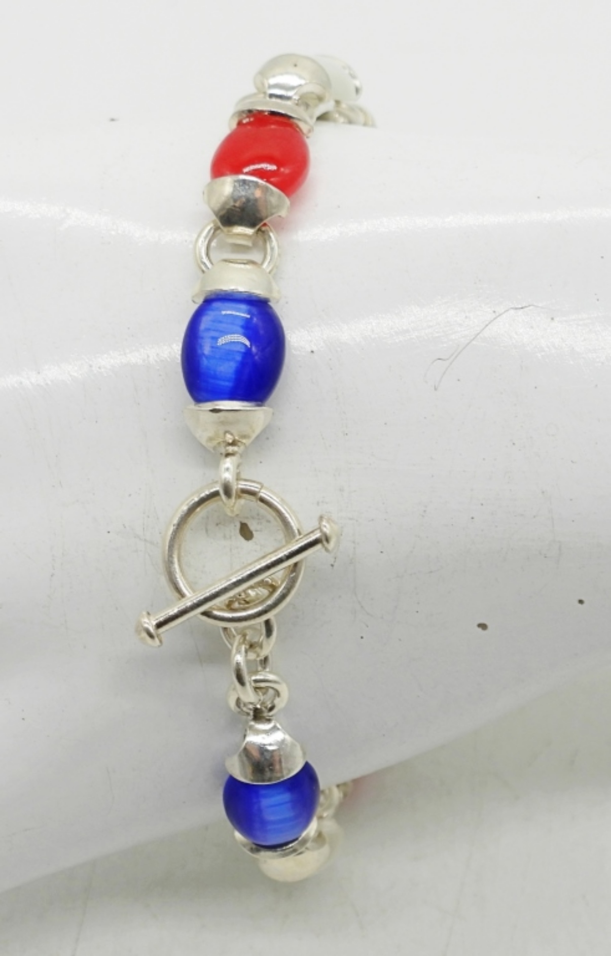 CATS EYE GEMSTONES, STERLING SETTING. RED WHITE AND BLUE. 7″. 13.8 DWT