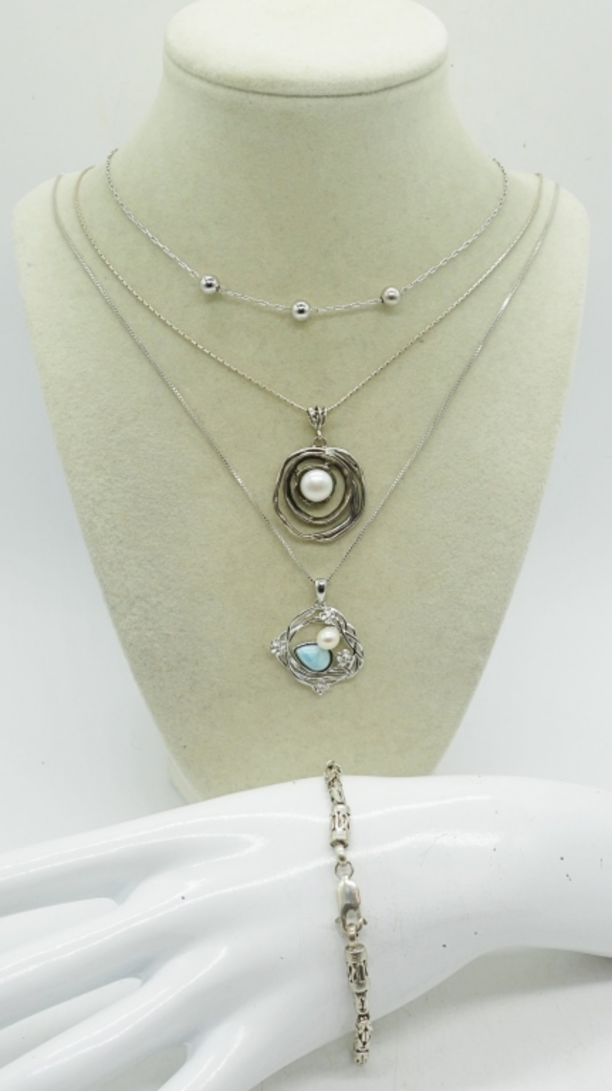 3 STERLING NECKLACES. PEARL , LARIMAR & BEADED. 14″, 18″, 20″ CHAINS. ONE STERLING BRACELET, 8″. 18.4 DWT