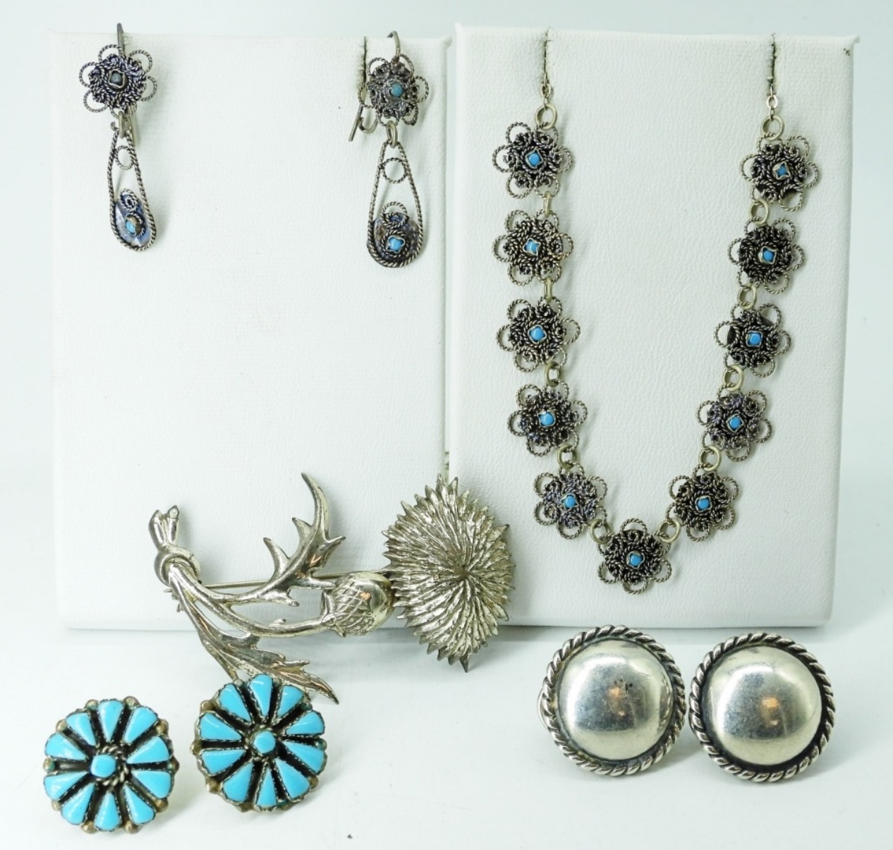 VINTAGE STERLING FILIGREE, PETITE NECKLACE & PIERCED EARRINGS. 16″. TWO PAIR VINTAGE PIERCED EARRINGS. STERLING LANG BROOCH. 18.6 DWT