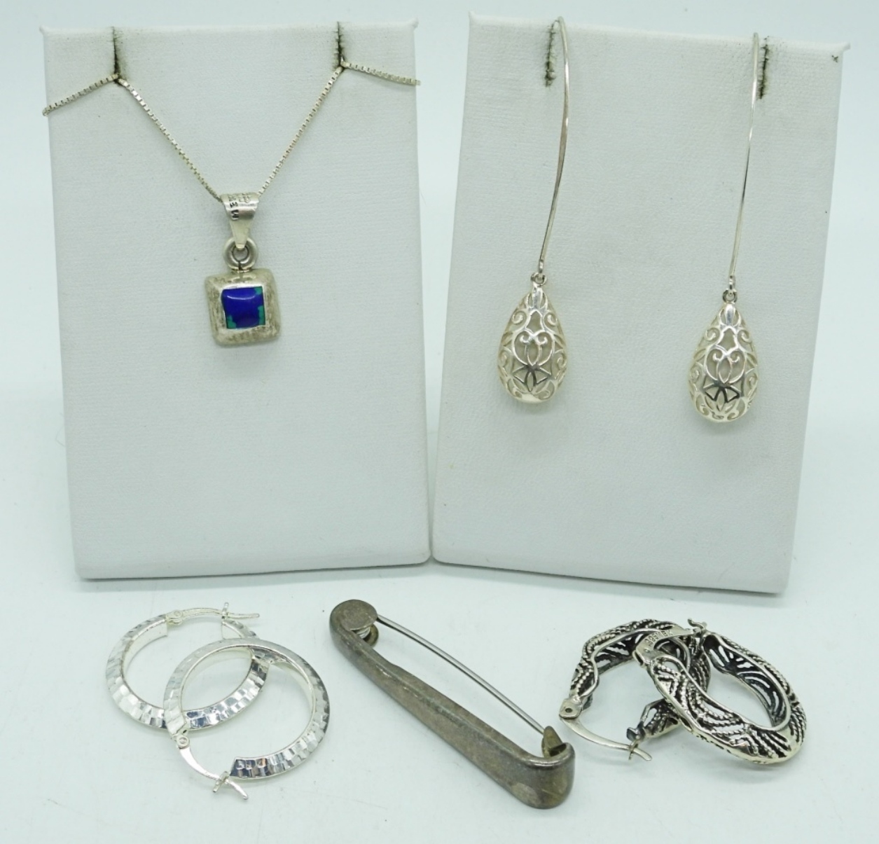VINTAGE MEXICO 925 NECKLACE, 16″. 3 PAIR OF STERLING PIERCED EARRINGS. ONE VINTAGE STERLING “SAFETY CLIP”. 14.3 DWT
