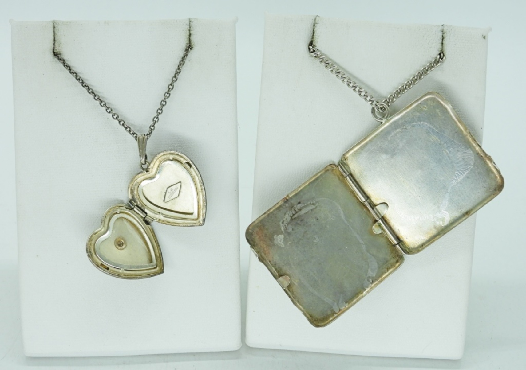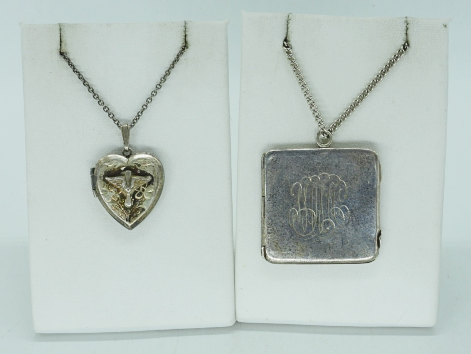 TWO VINTAGE STERLING LOCKETS. TARNISHED. CHAINS ARE 18″ & 24″. 14.5 DWT