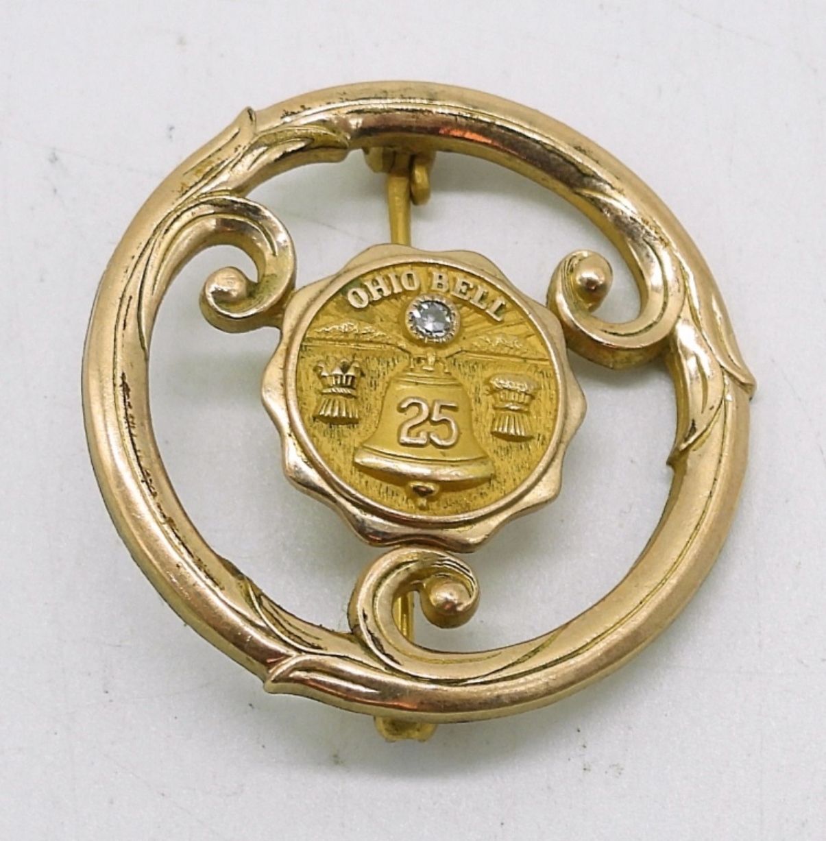 VINTAGE OHIO BELL 25 YEAR PIN, THIS IS 10 K YELLOW GOLD WITH A GENUINE DIAMOND!! MEASURES 1″. 4.1DWT
