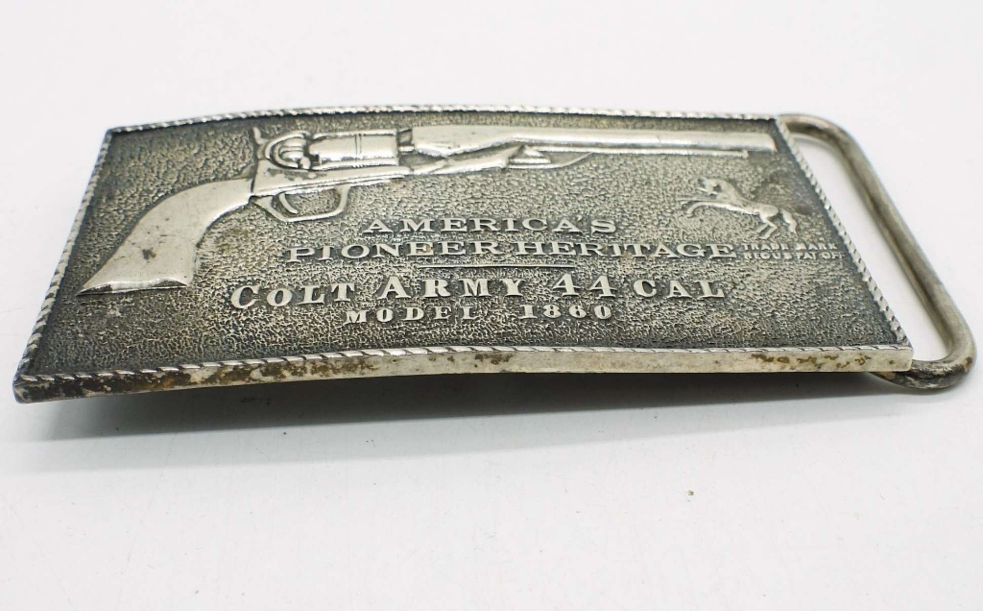 “AMERICA’S PIONEER HERITAGE” COLT ARMY 44 CAL MODEL 1860 BELT BUCKLE, STERLING. 4″x2″. 89.9 DWT
