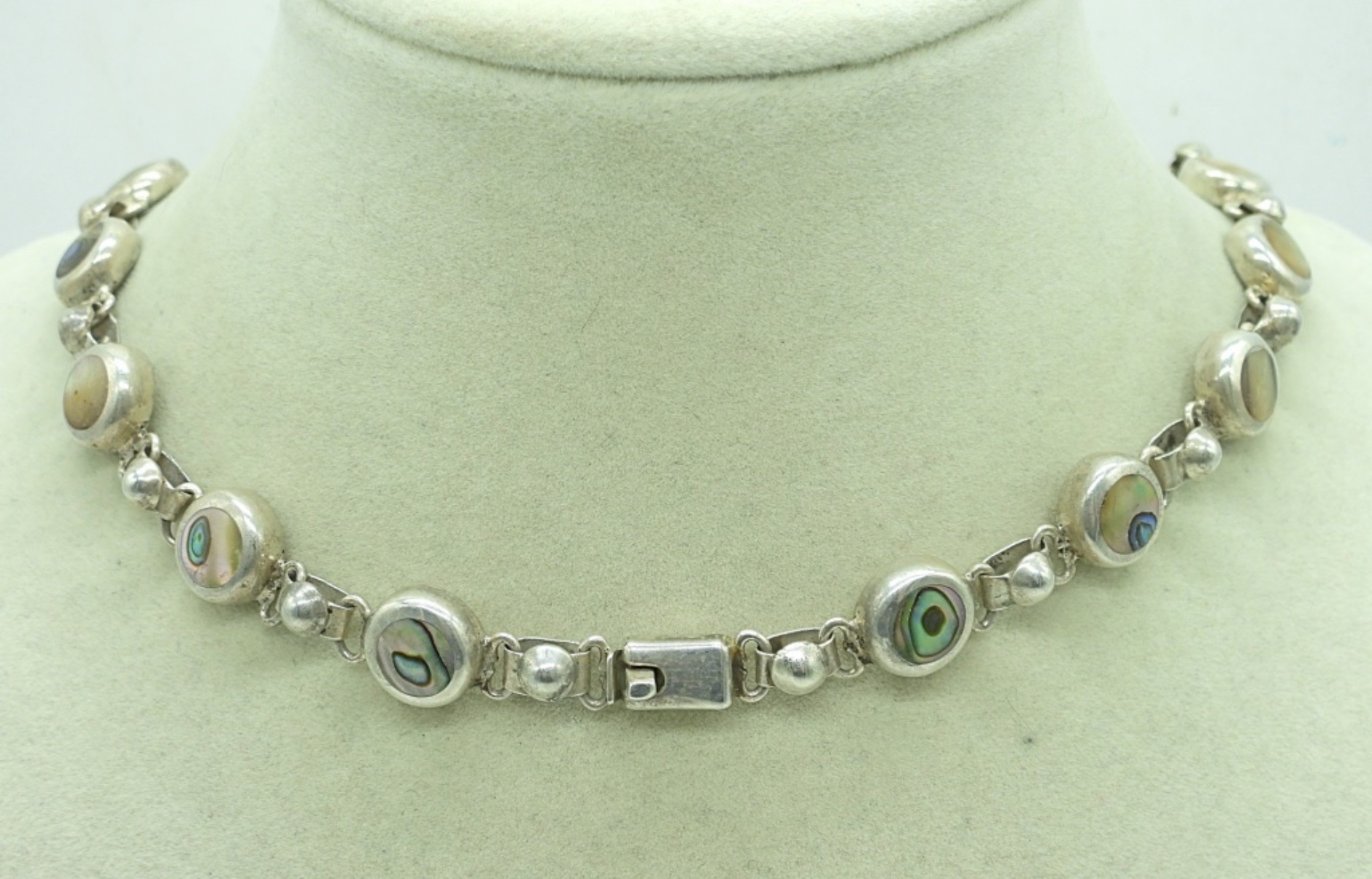 17″ STERLING MEXICO NECKLACE WITH ABALONE SHELL INLAY. 37.6 DWT