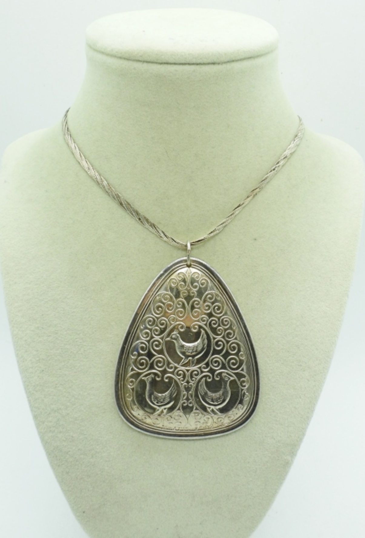 TOWLE THREE FRENCH HENS, 1973 STERLING SILVER ORNAMENT, 3″. STERLING CHAIN, 16″ CHAIN. 20.4 DWT