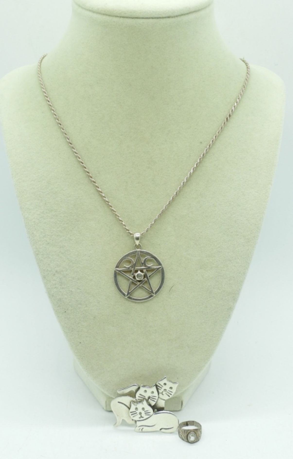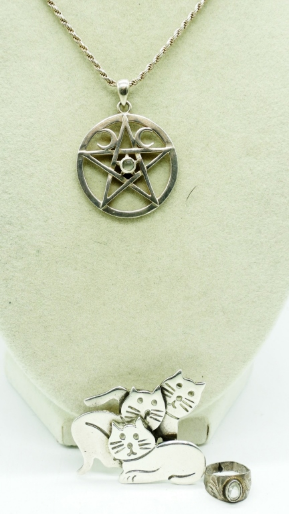 STERLING TRIPLE MOON GODDESS PENTACLE NECKLACE, 30″. MEXICO 925 CAT BROOCH. TINY STERLING RING PENDANT. 20 DWT