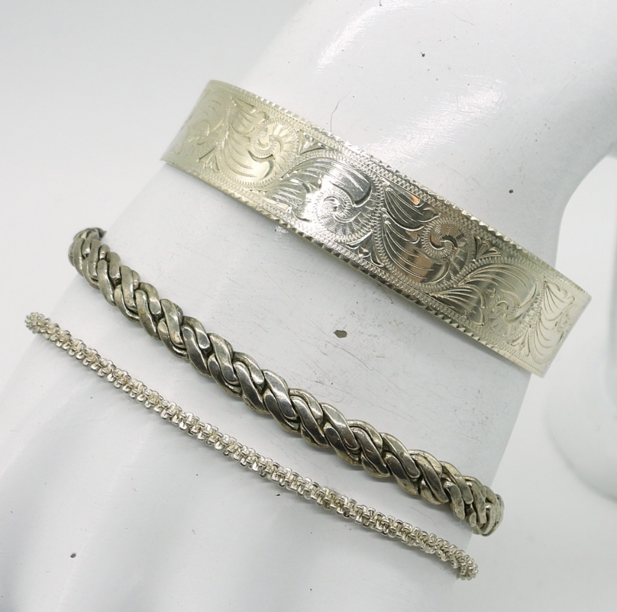 THREE STERLING FASHION BRACELETS. TWO CHAIN BRACELETS, 7.5″ & 8″. CUFF 7″. 23.2 DWT