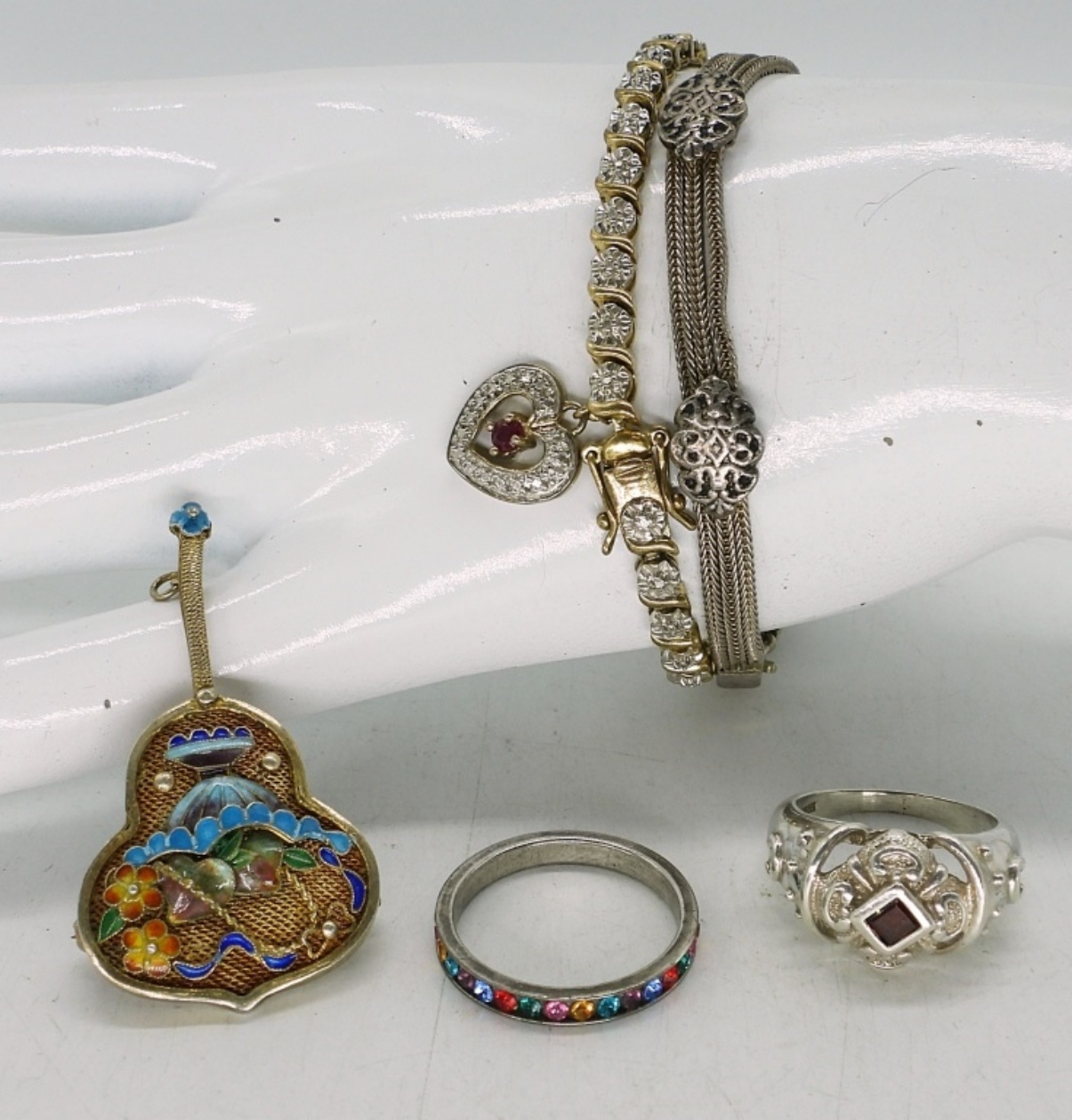 TWO STERLING BRACELETS, 7″. TWO STERLING RINGS, 8 & 10. GUITAR GOLD TONE BROOCH. 23.9 DWT