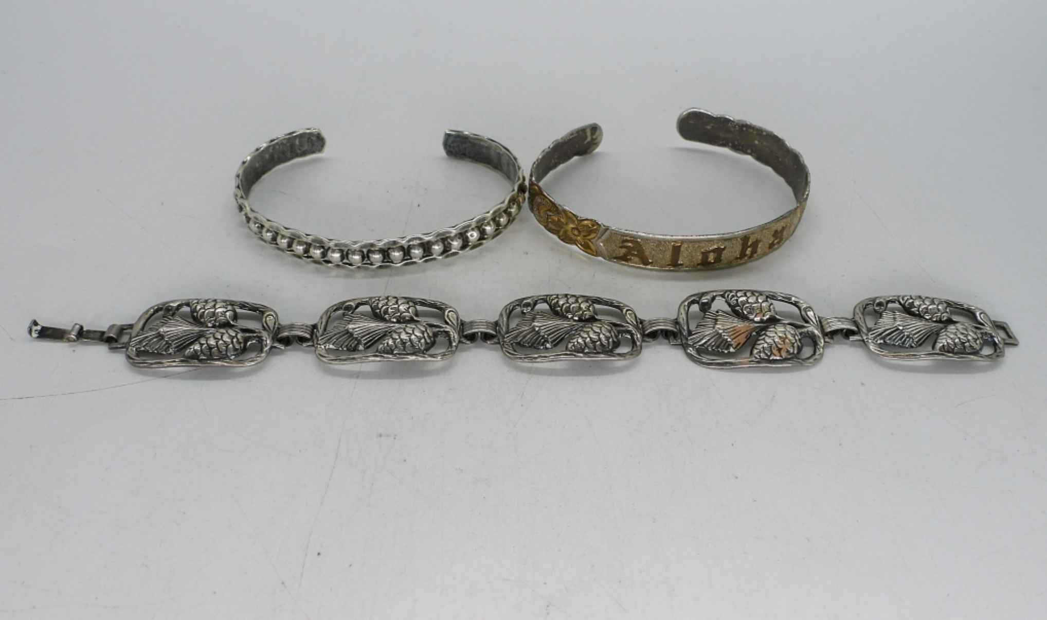 DANECRAFT STERLING PINECONE BRACELET, 7″. STERLING MEXICO 925 CUFF BRACELET. GOLD TONE STERLING “ALOHA” CUFF BRACELET. 33 DWT