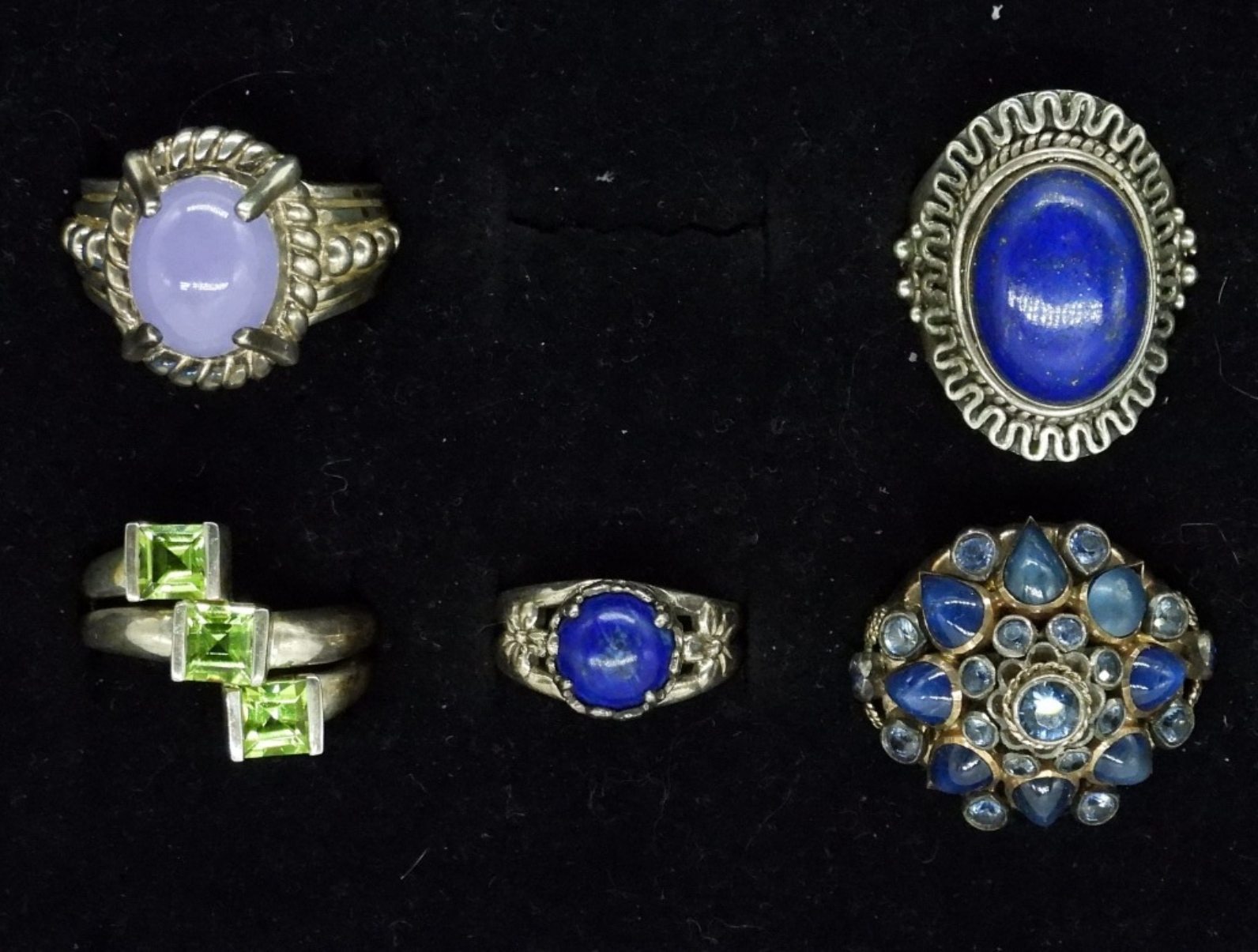 FIVE STERLING RINGS, GEMSTONES. SIZES 5-9. 26.4 DWT