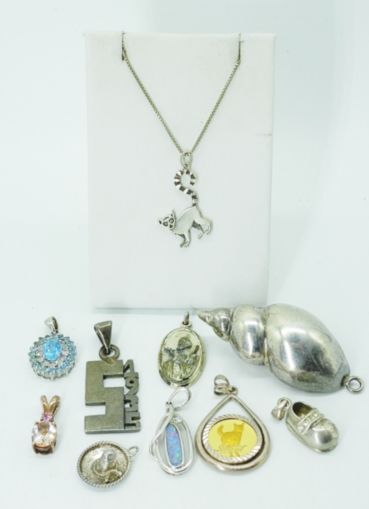 TEN VINTAGE AND MODERN STERLING SILVER PENDANTS. ONE STERLING CHAIN, 18″. 28.1 DWT
