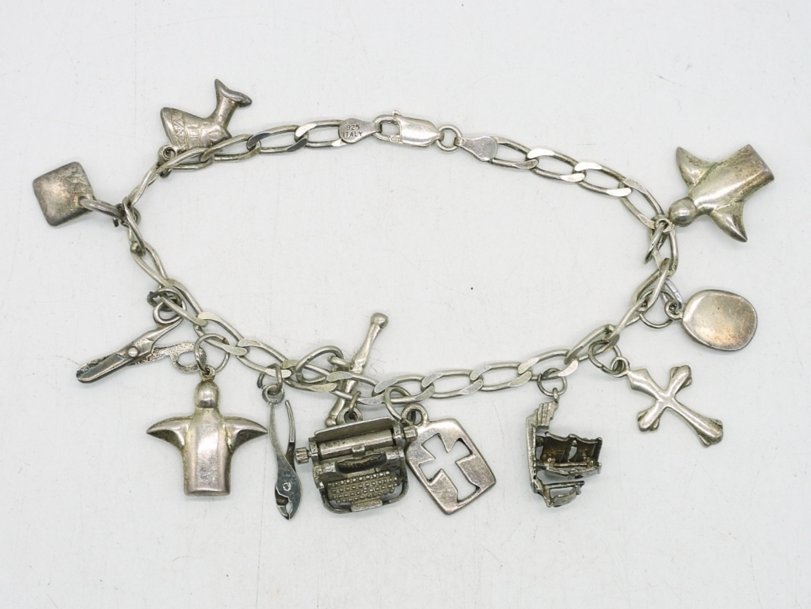 8″ VINTAGE STERLING CHARM BRACELET WITH 12 STERLING CHARMS. 16 DWT