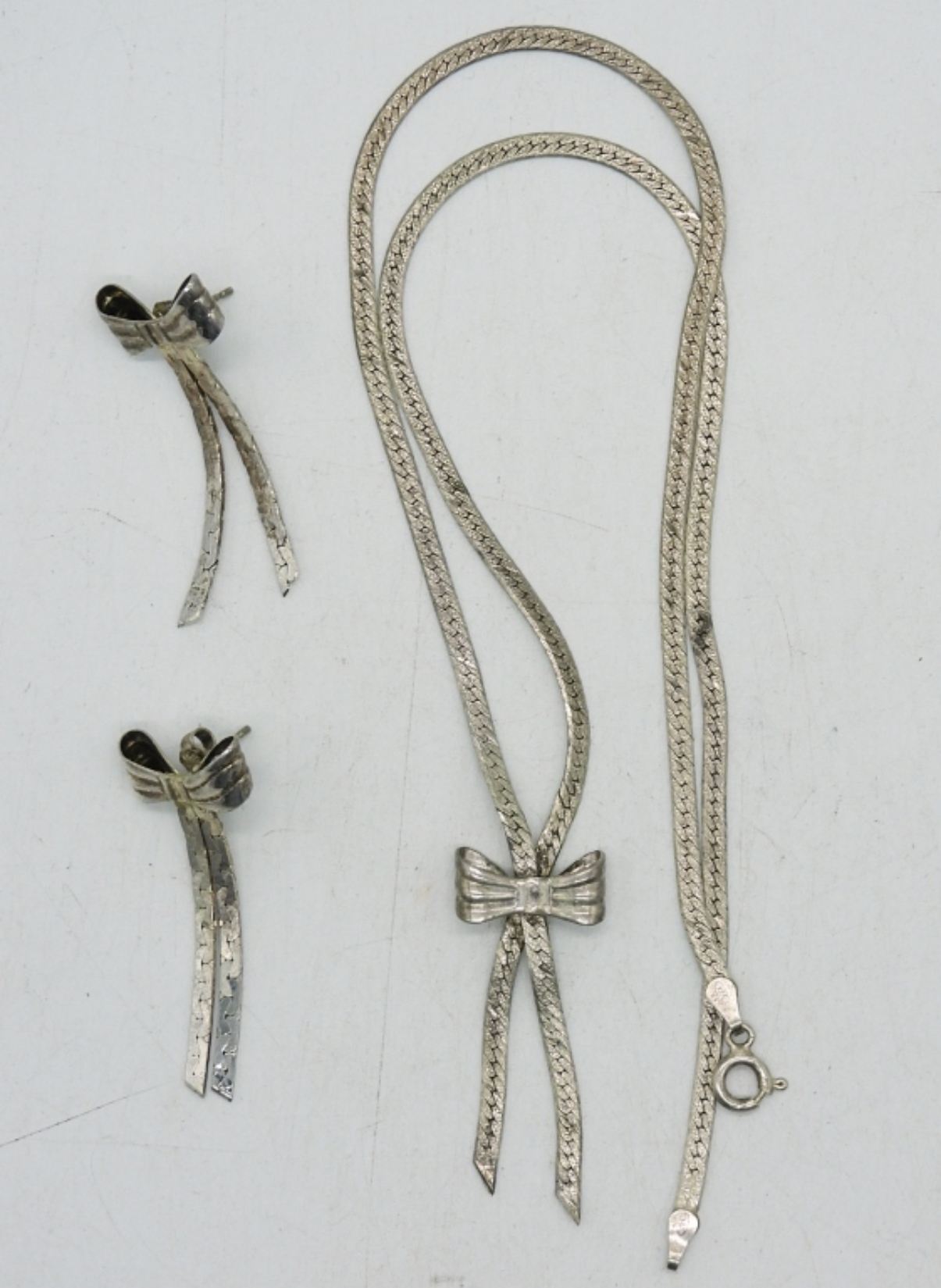 VINTAGE STERLING BOWS SET. NECKLACE IS 18″. EARRINGS ARE PIERCED. CLASP ON NECKLACE DOES NOT WORK EASILY, NEEDS SOME REPAIR!!! 6 DWT
