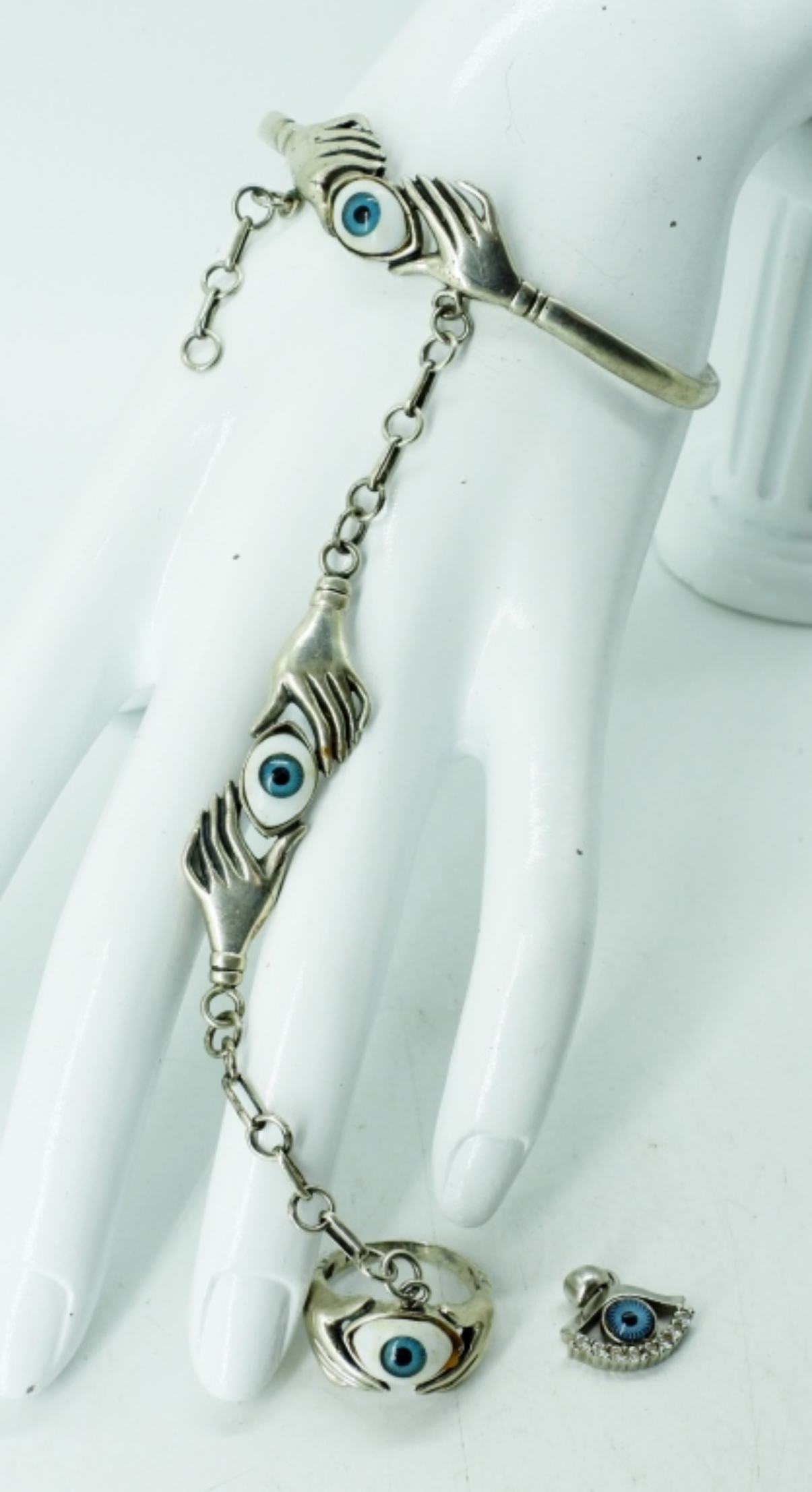 EVIL EYE, STERLING SILVER BRACELET WITH ATTACHED RING (6.5). STERLING EVIL EYE PENDANT. 15.2 DWT