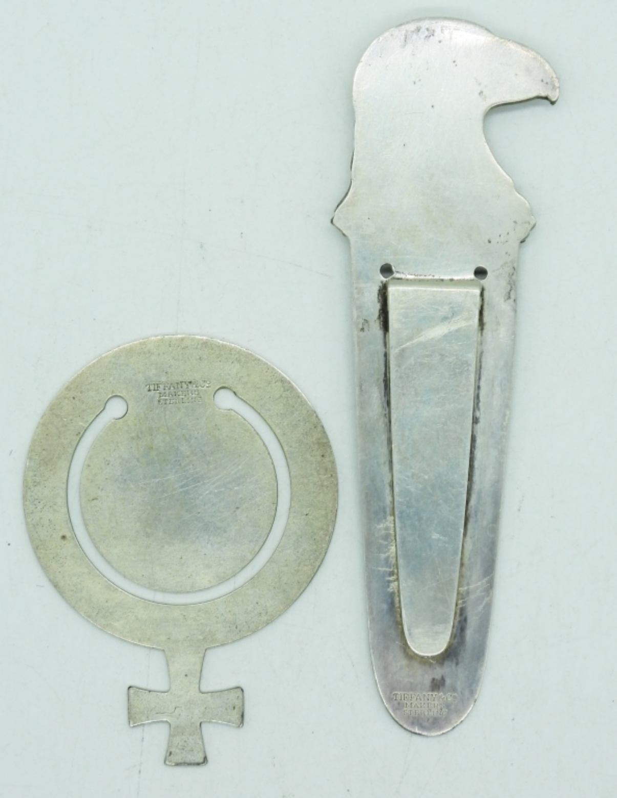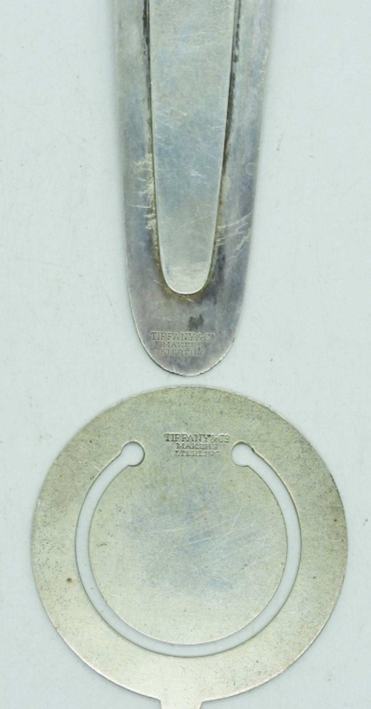 TWO TIFFANY & CO STERLING BOOKMARKS. BOTH MARKED “TIFFANY & CO MAKERS STERLING”. 2″ & 3.5″. 16.1 DWT