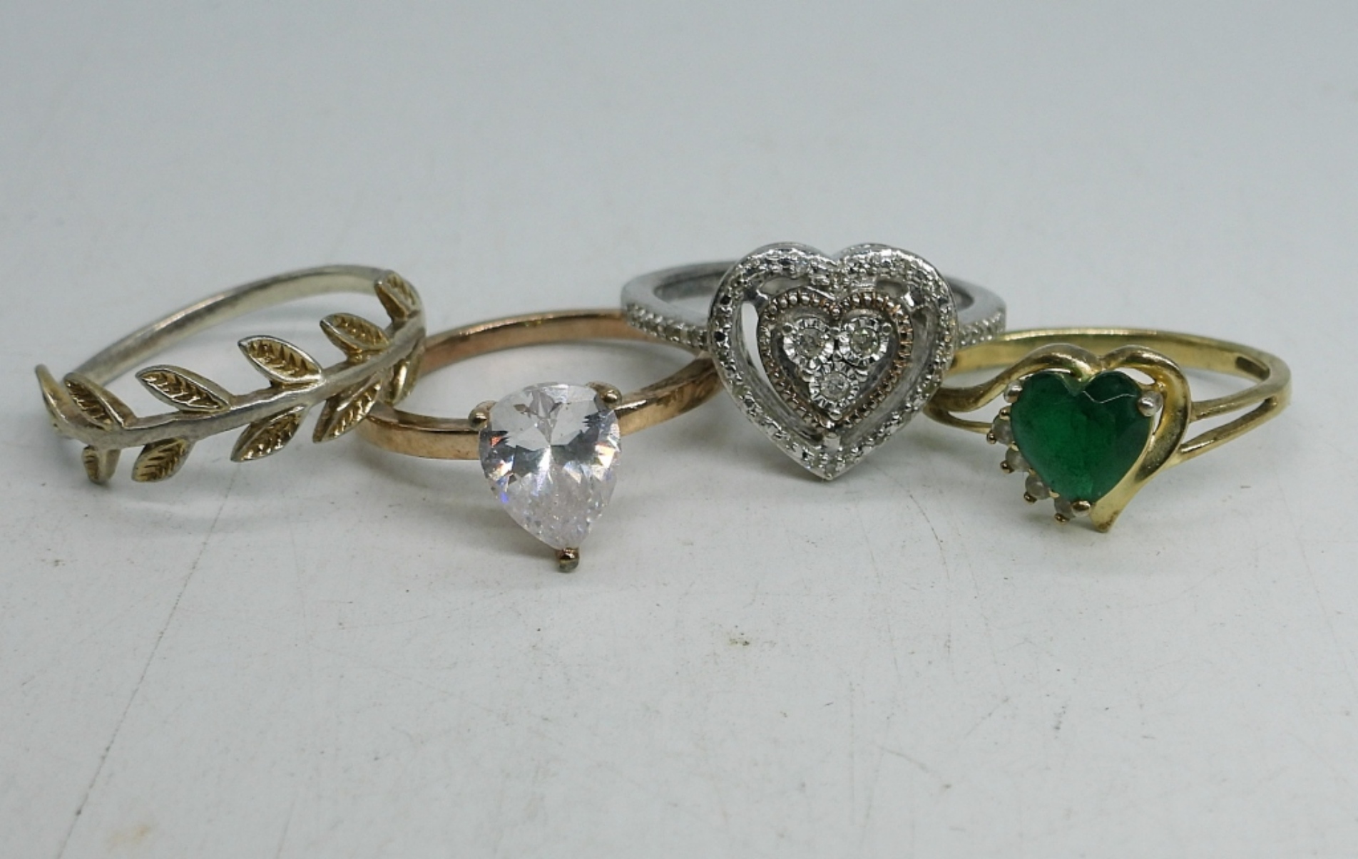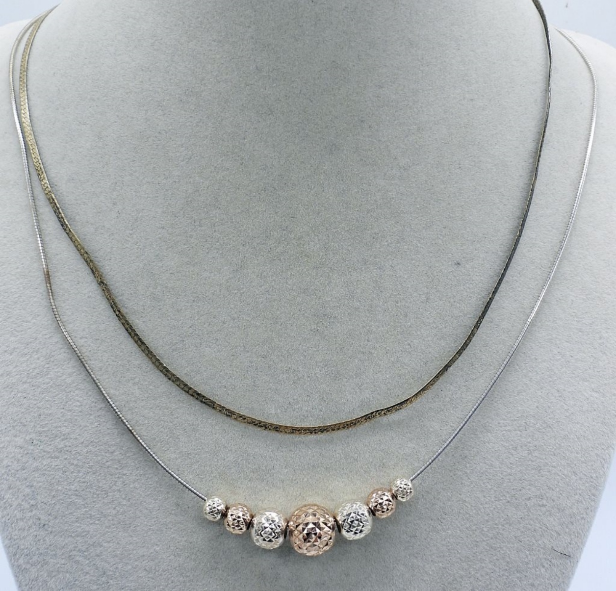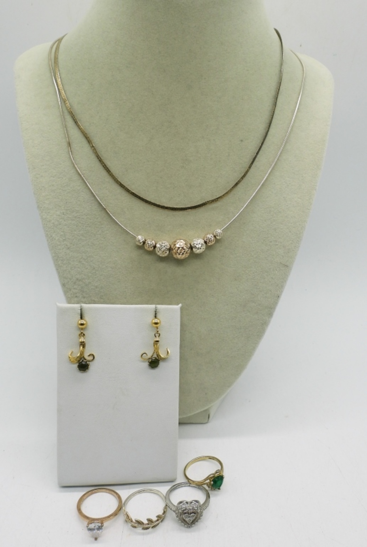 FOUR STERLING RINGS IN SILVER, GOLD & ROSE GOLD TONES, SIZES 6, 7, 8.5. GOLD TONE EARRINGS AND TWO STERLING TRI TONE NECKLACES, 17.5″ & 20″. 14.7 DWT