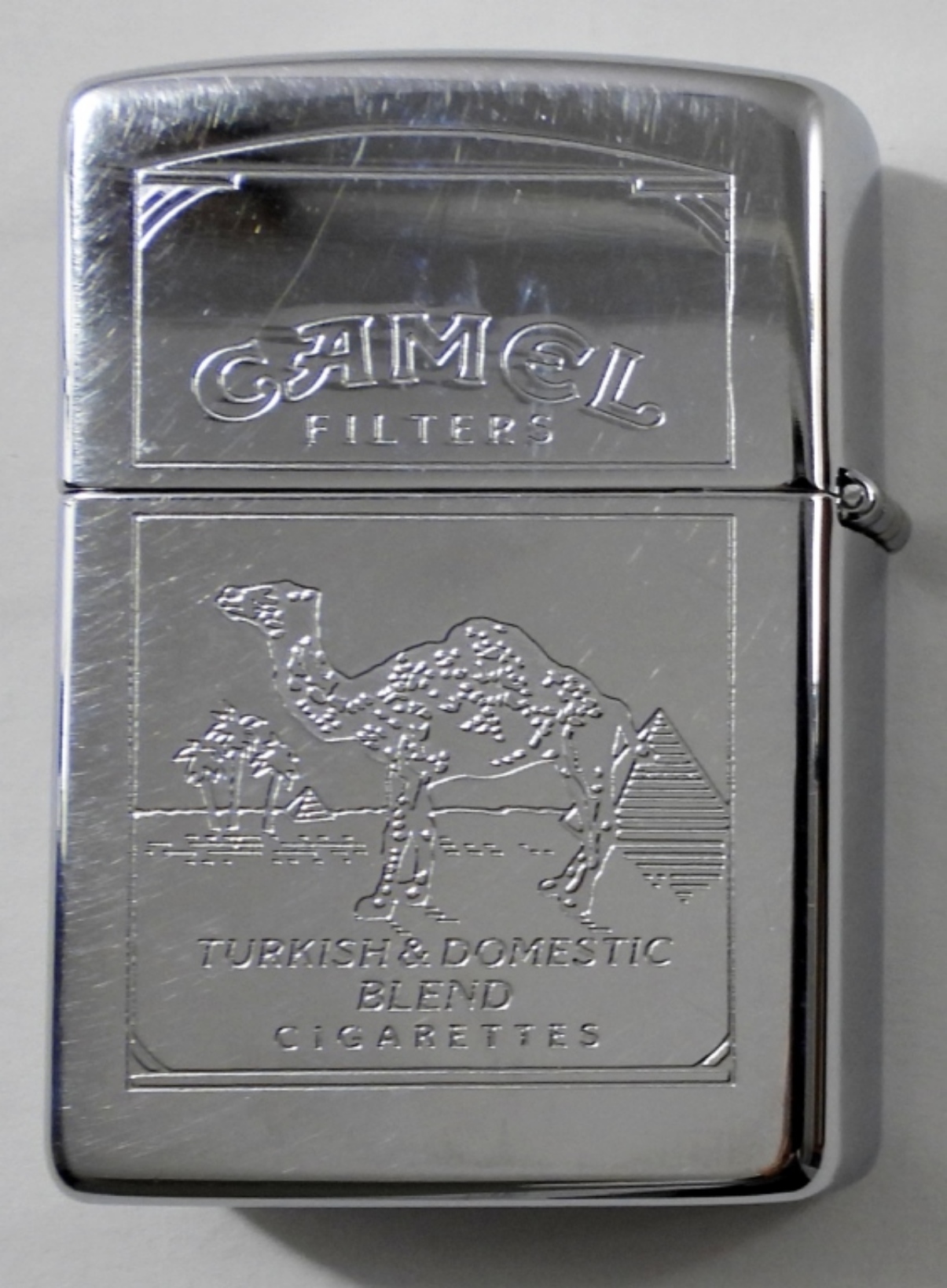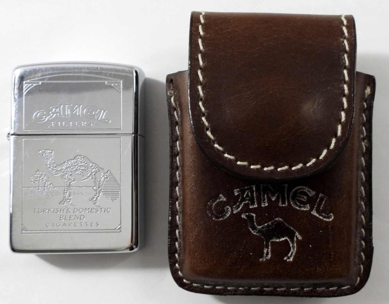 1995 FIRED CHROME CAMEL ETCHED DOUBLE- SIDED ZIPPO IN A BROWN LEATHER CAMEL LIGHTER CASE