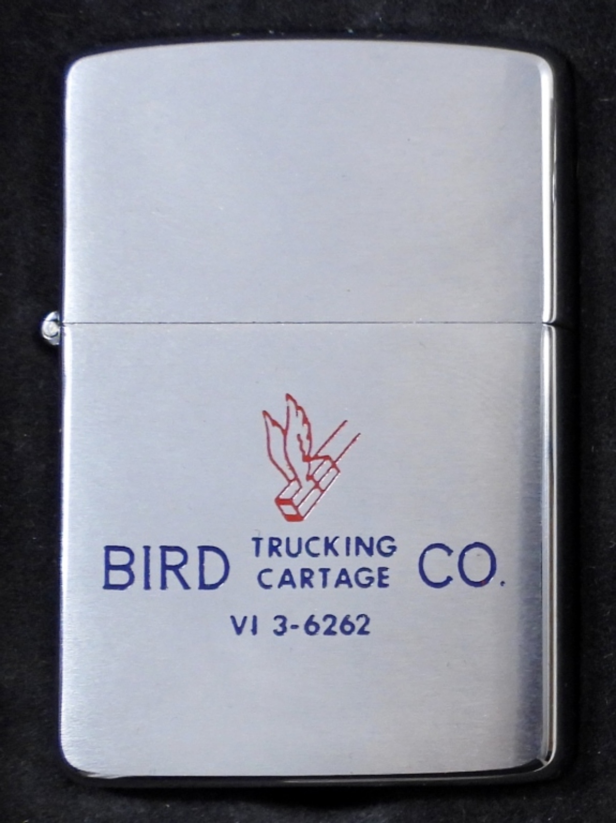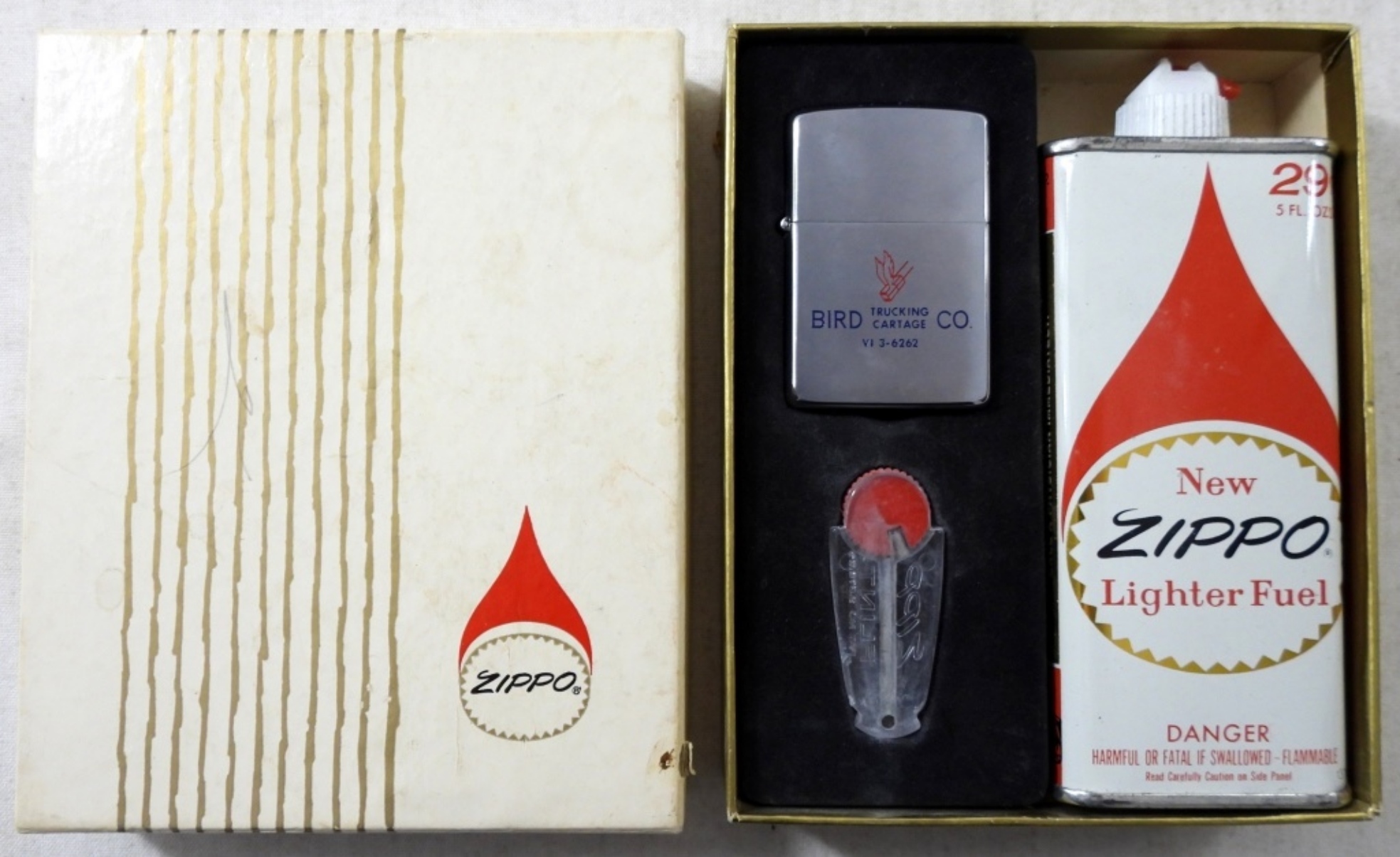 VINTAGE 1967 UNFIRED CHROME ZIPPO WITH BIRD TRUCKING CARTAGE CO. LOGO COMES WITH FLINT AND LIGHTER FLUID GIFT BOX SET