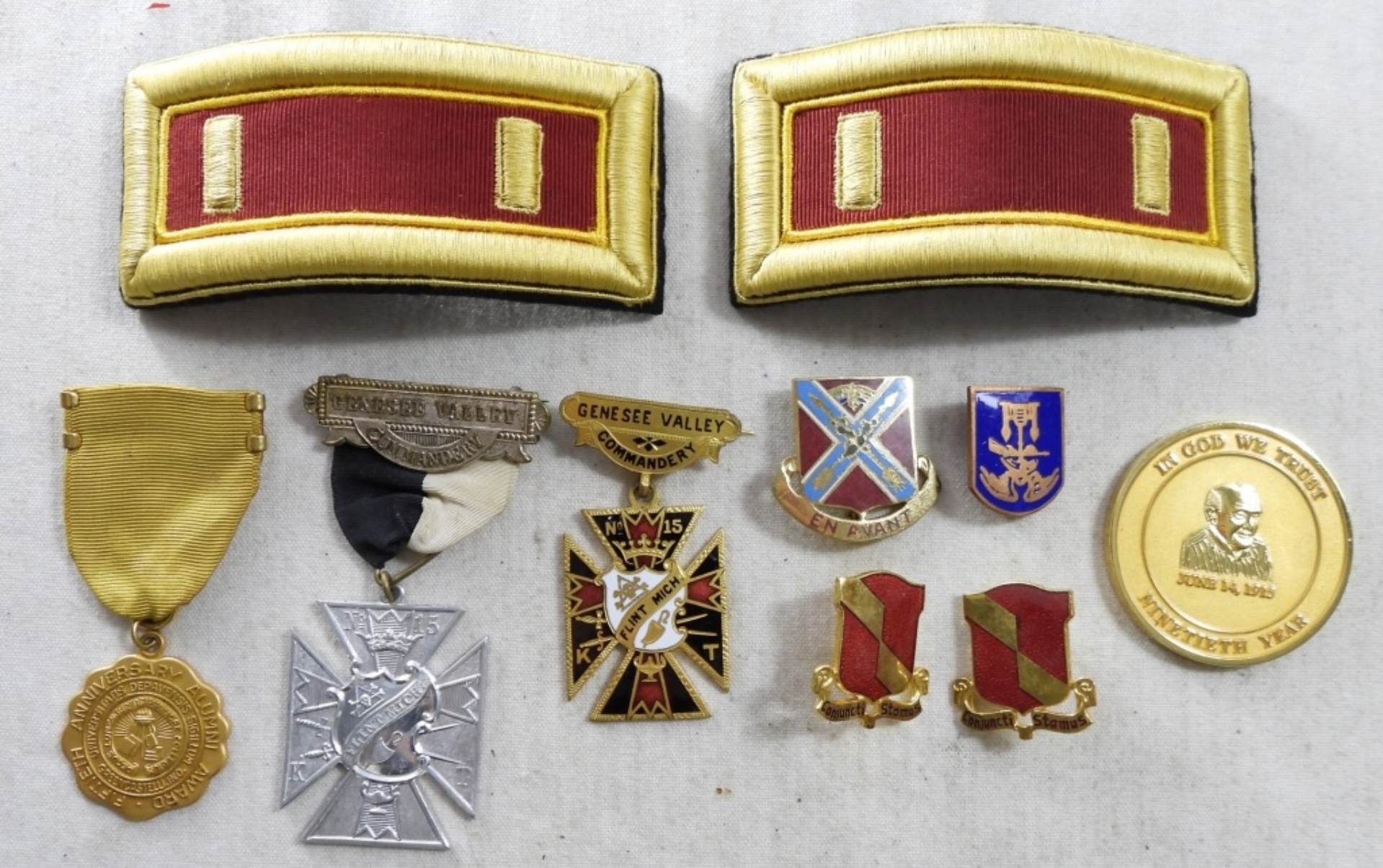 (2) 2nd LIEUT. SHOULDER STRAPS, PINS, COMMEMORATIVE COIN & MORE