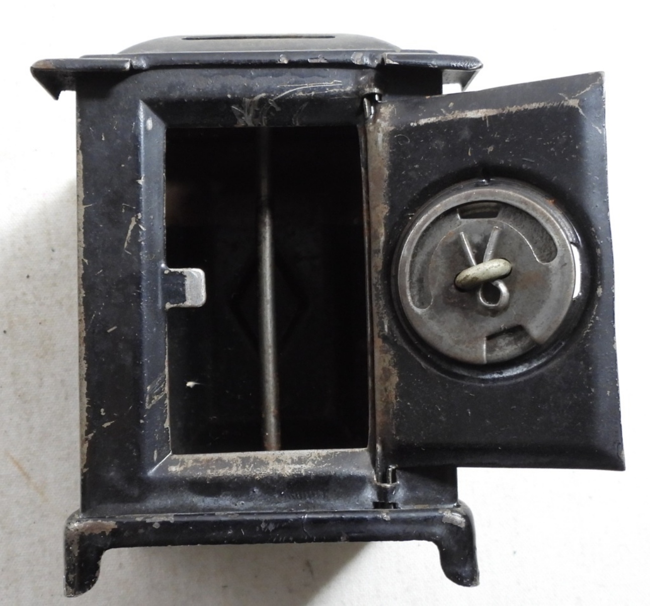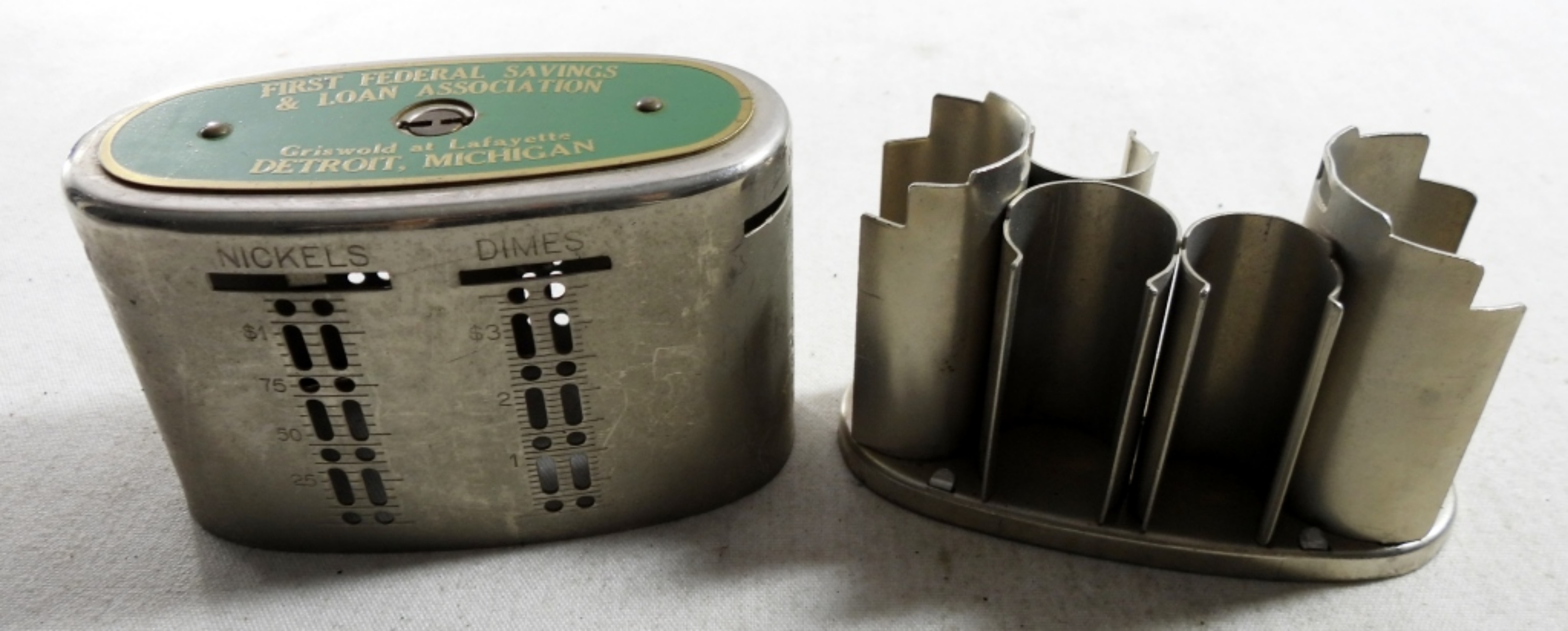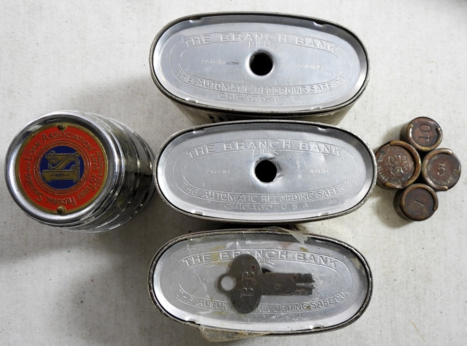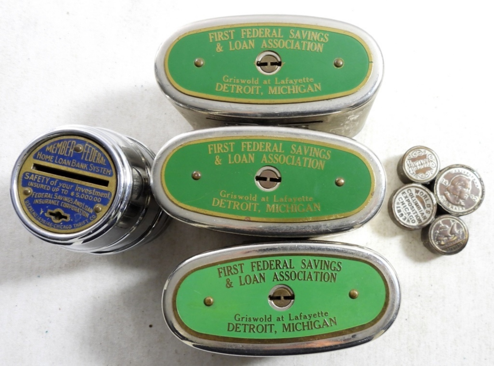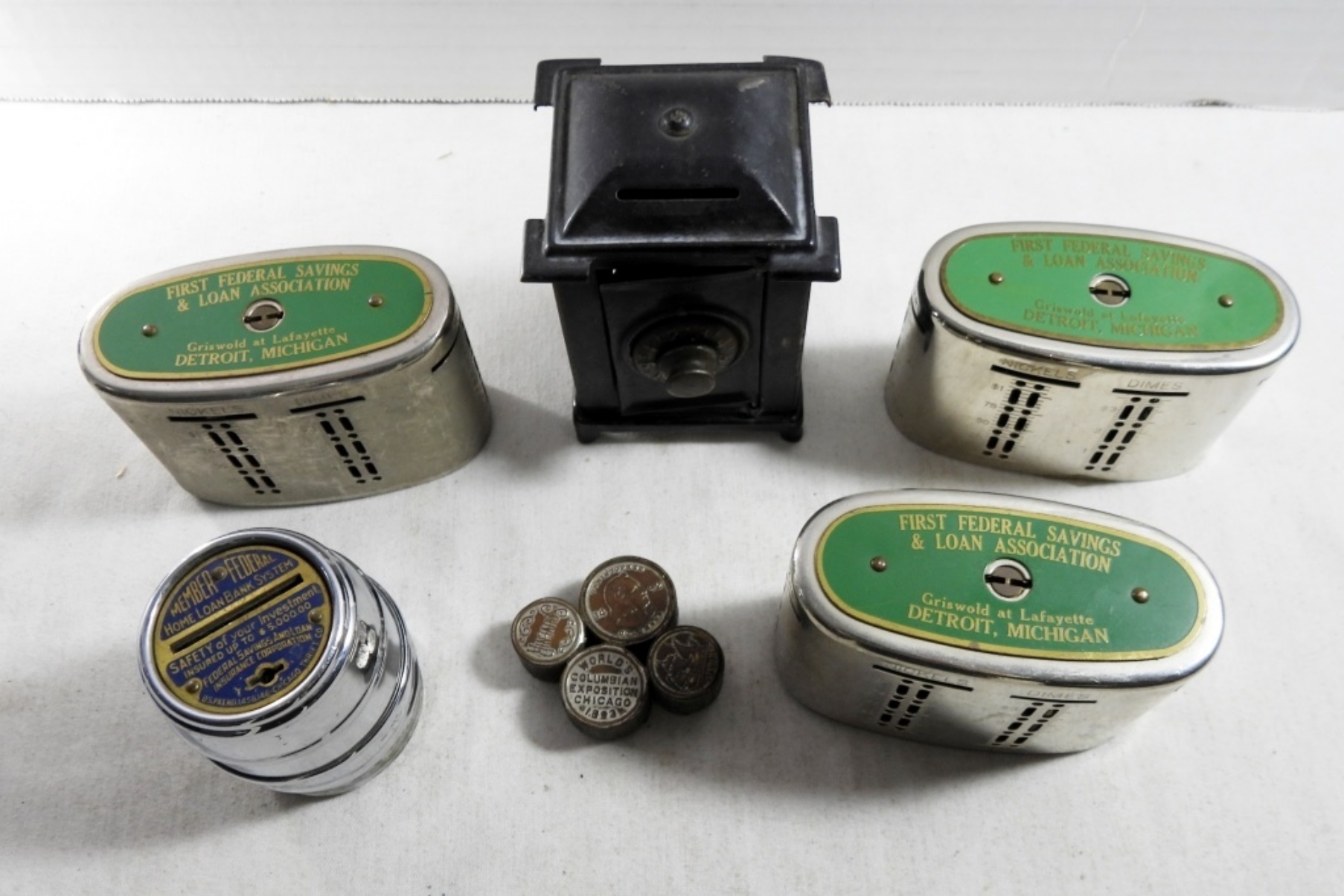 (4) FEDERAL SAVINGS (3) THE SAME with LOOSE BOTTOMS, (1) STOVE TYPE BANK (1) COIN KEEPER