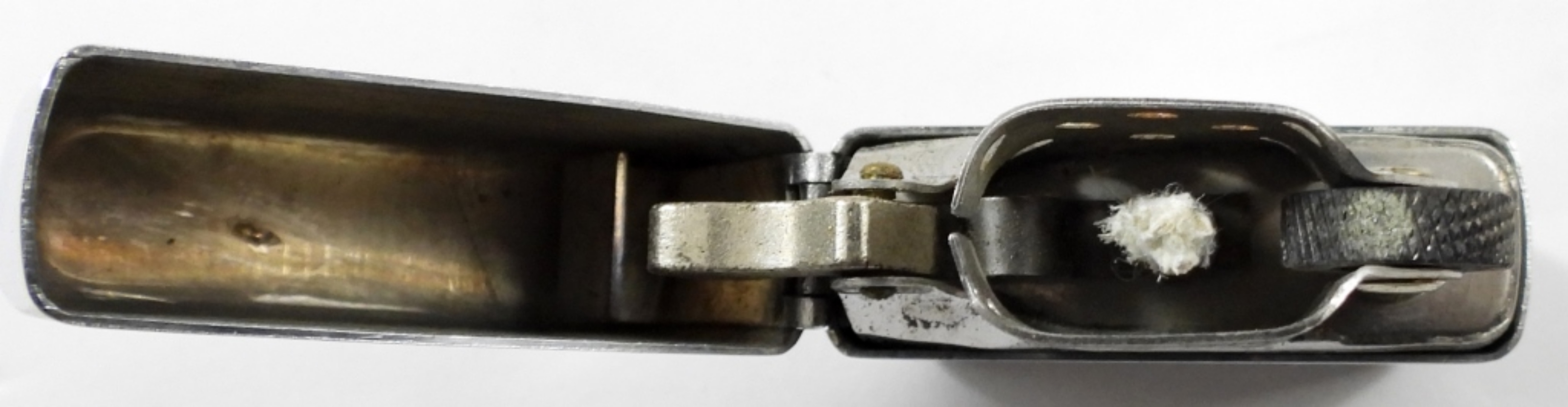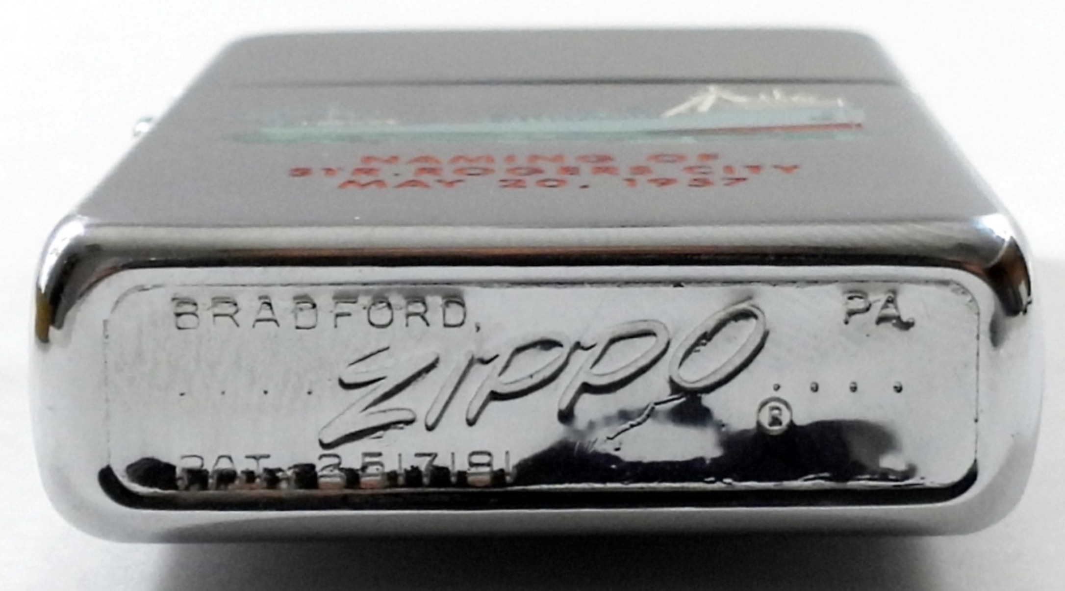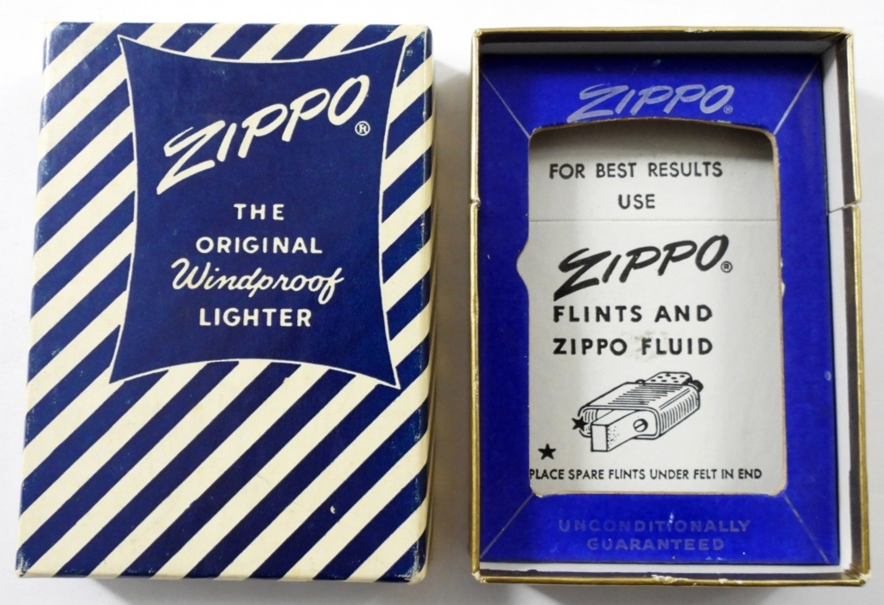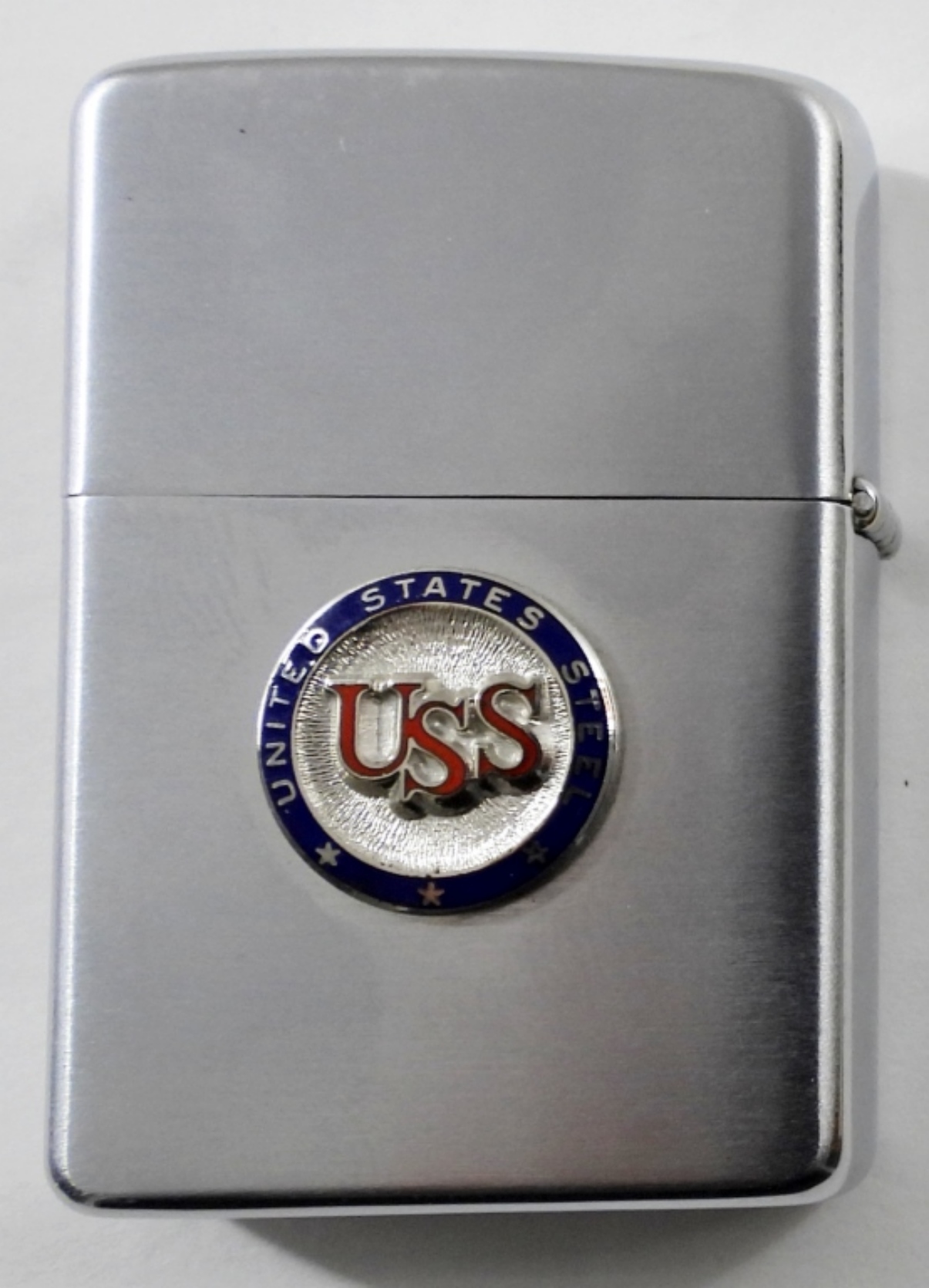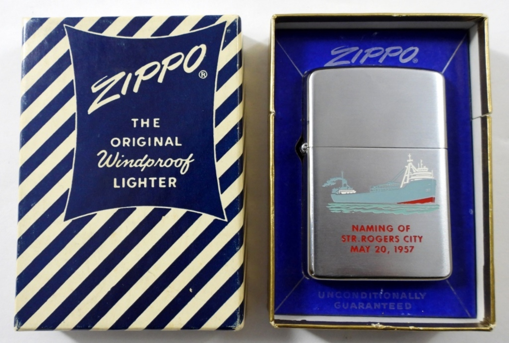 1958 UNFIRED CHROME ZIPPO LIGHTER PAT PEND (2517191 WITH MATCHING INSERT)WITH USS ( UNITED STATES STEEL) LOGO ON 1 SIDE AND NAMING OF STR. ROGERS CITY ON THE OTHER IN A ORIGINAL BLUE AND WHITE STRIPED BOX