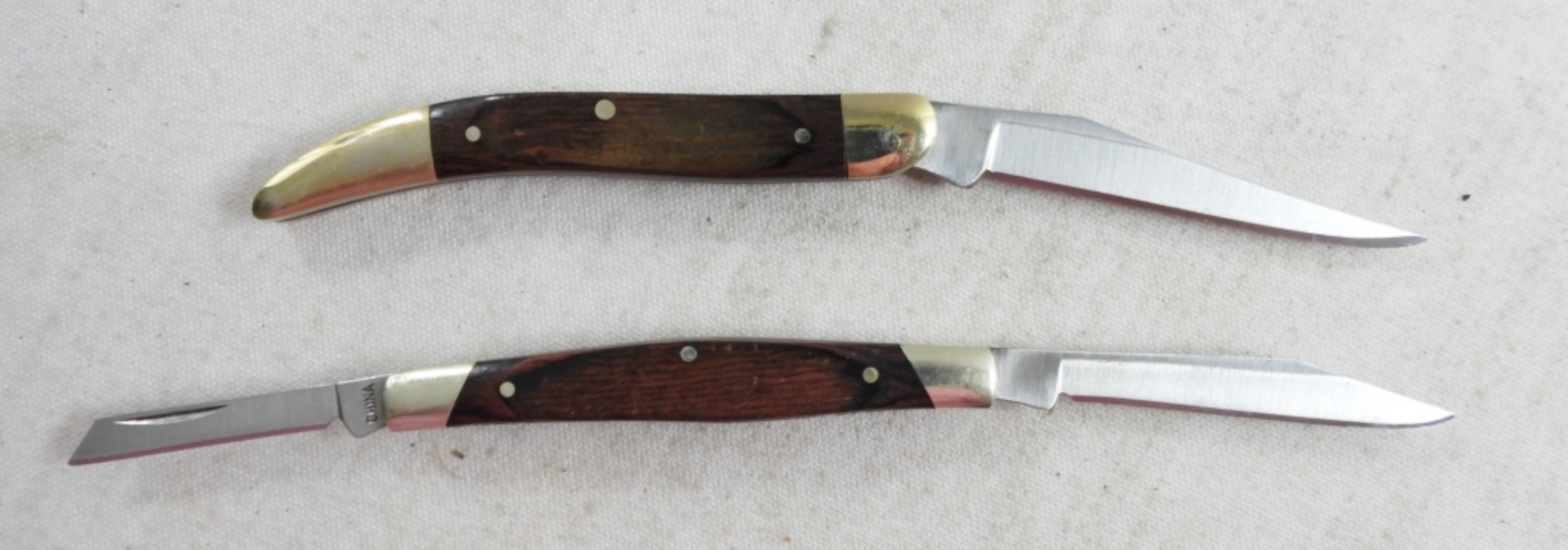 (2)BUCK SINGLE BLADE MINI POCKET KNIVES, (1) 2″ 385 MINI TEXAS TOOTHPICK POCKET KNIFE, (1) 2″ DOUBLE BLADE MINI POCKET KNIFE BOTH WITH BROWN HANDLES