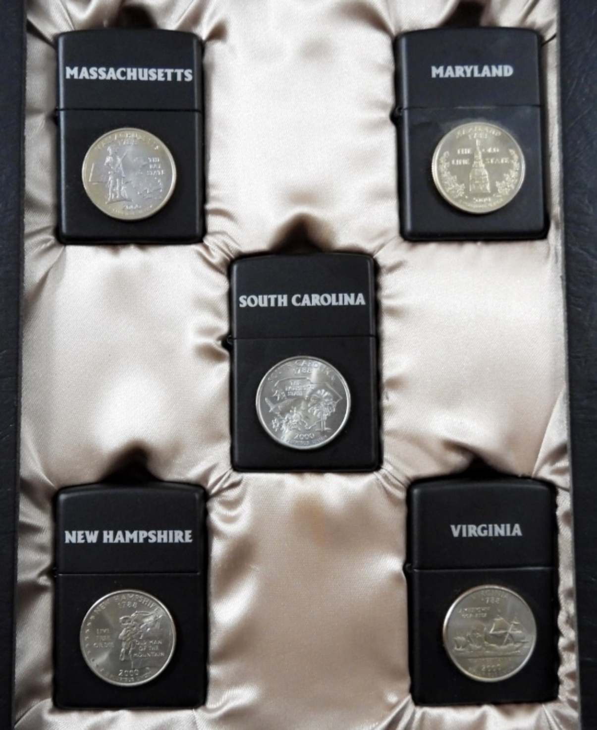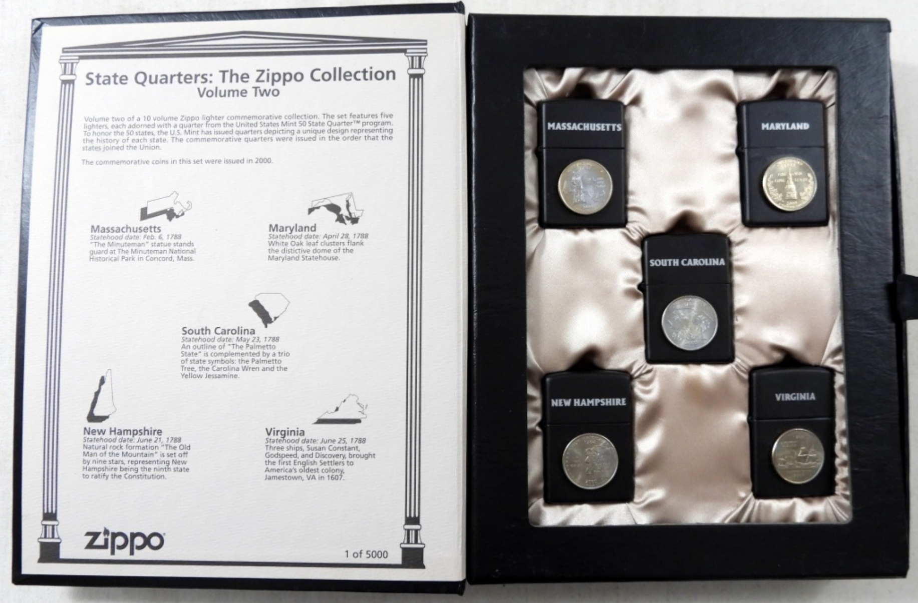 2000 STATE QUARTER AND 2000 ZIPPO COLLECTION, VOL 2, 5 ZIPPOS ,1 SEALED, 4 UNFIRED,(STICKER ADHESIVE CAME OFF STICKER IS UNDER THE LIGHTERS) IN A SATIN AND BLACK COLLECTORS BOX