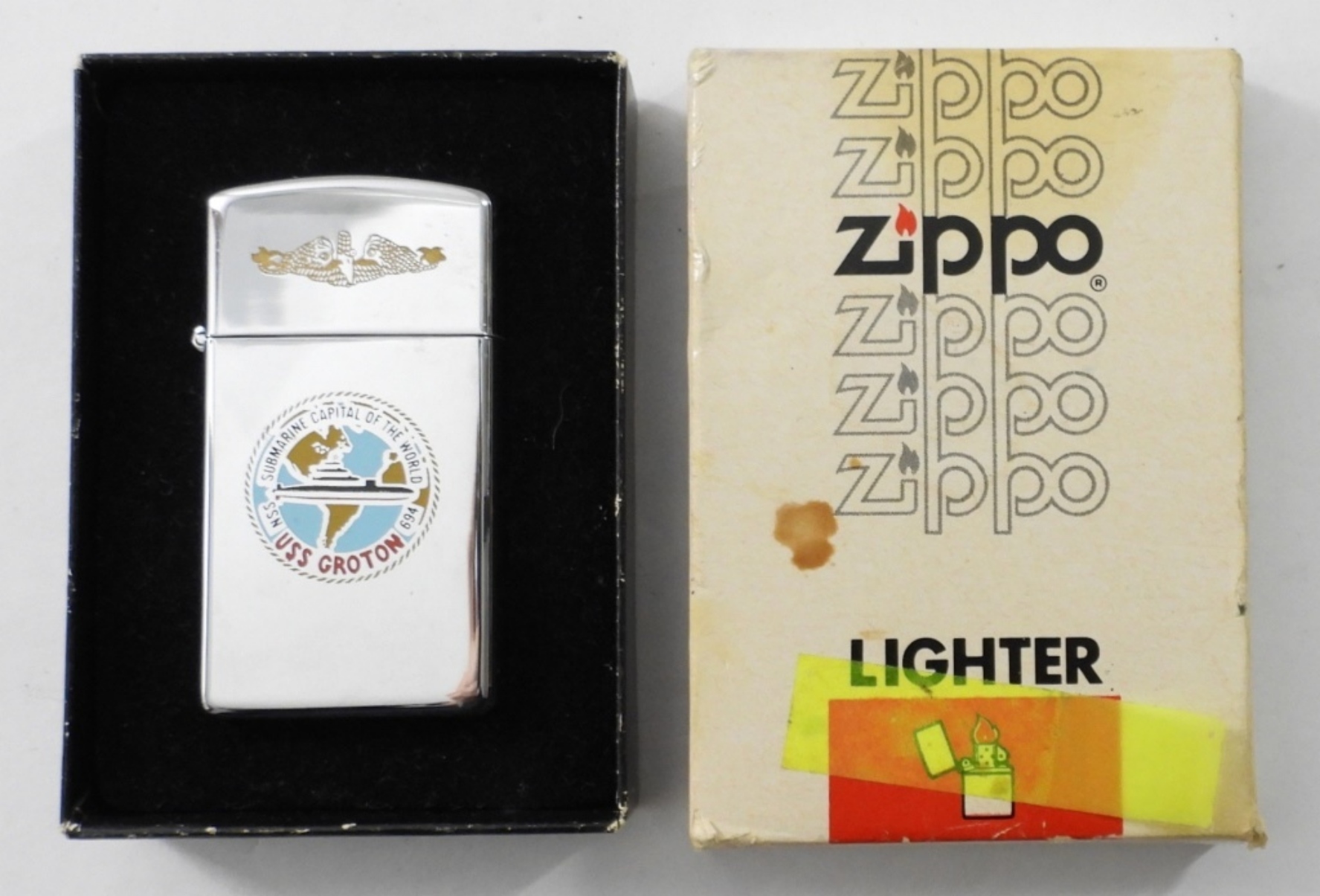 1981 UNFIRED SLIM CHROME USS GROTON LOGO ZIPPO IN ORIGINAL BOX