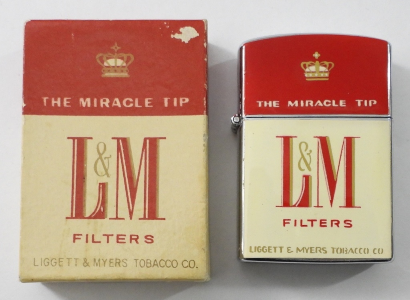 L&M CONTINENTAL UNFIRED LIGHTER IN ORIGINAL BOX, L&M CIGARETTE ADVERTIZING, INSTRUCTIONS STILL IN BOX, TOP COVER OF BOX TORN BOTTOM CORNERS