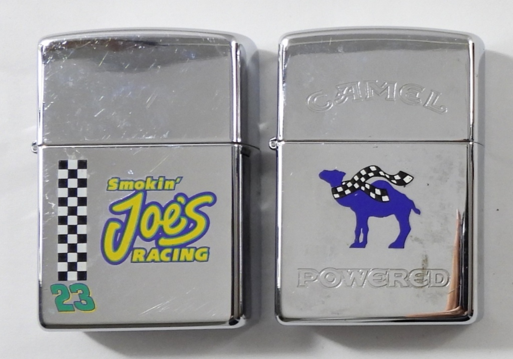 (2) 1997 UNFIRED CAMEL JOE ZIPPO LIGHTERS, 1 CAMEL POWERED, AND 1 SMOKIN JOES RACING