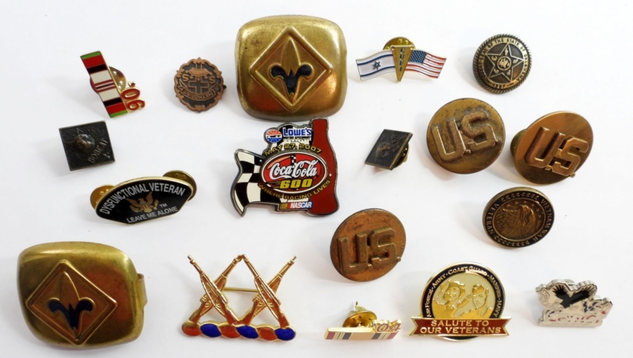 (19) VINTAGE ASSORTED PINS & MORE / SOME MILITARY, BOY SCOUT AND NASCAR