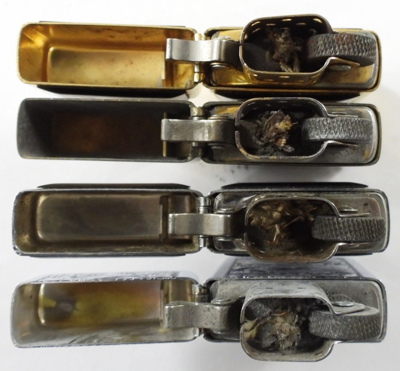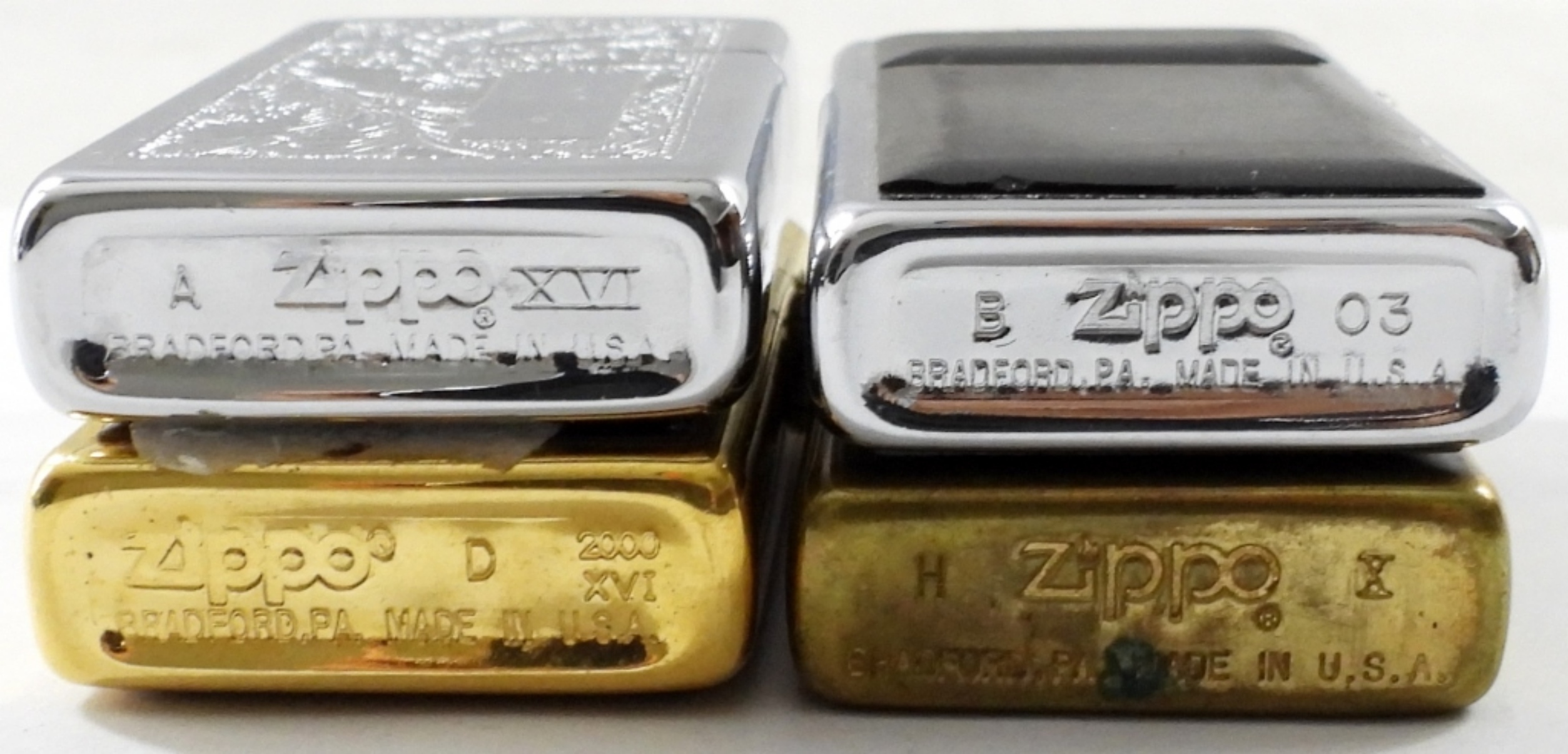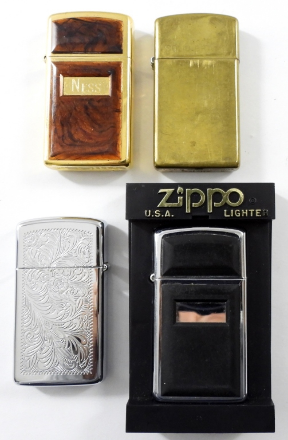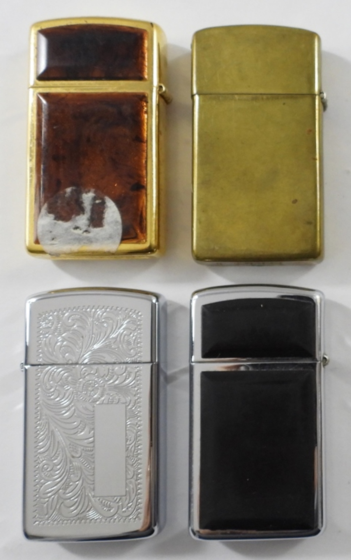 (4) FIRED SLIM ZIPPO LIGHTERS ,(1) 1994 BRASS FIRED SLIM ZIPPO(,2) 2000 FIRED SLIM ZIPPOS CHROME AND AMBER/GOLD AND( I ) FIRED CHROME/BLACK SLIM LIGHTER IN CASE
