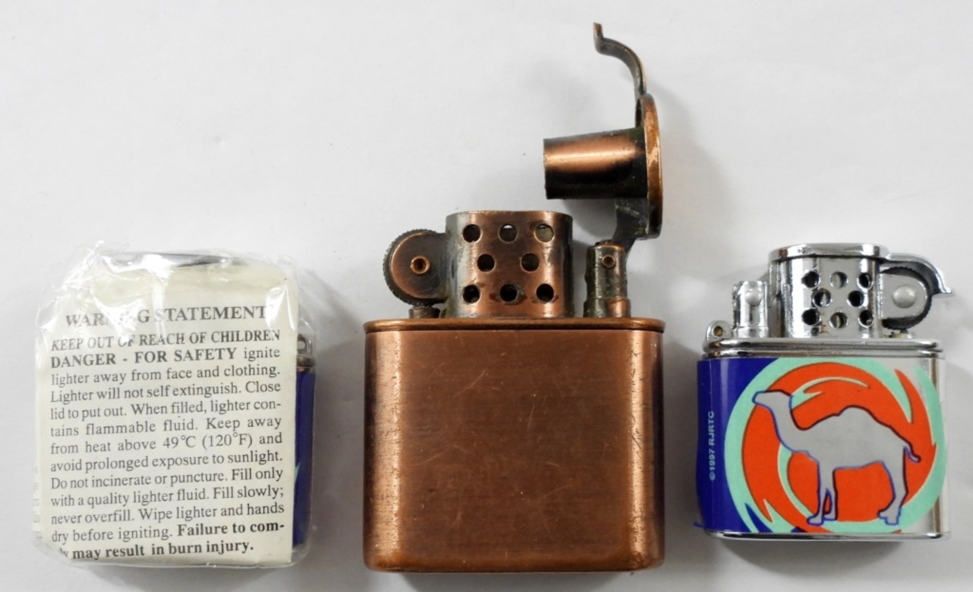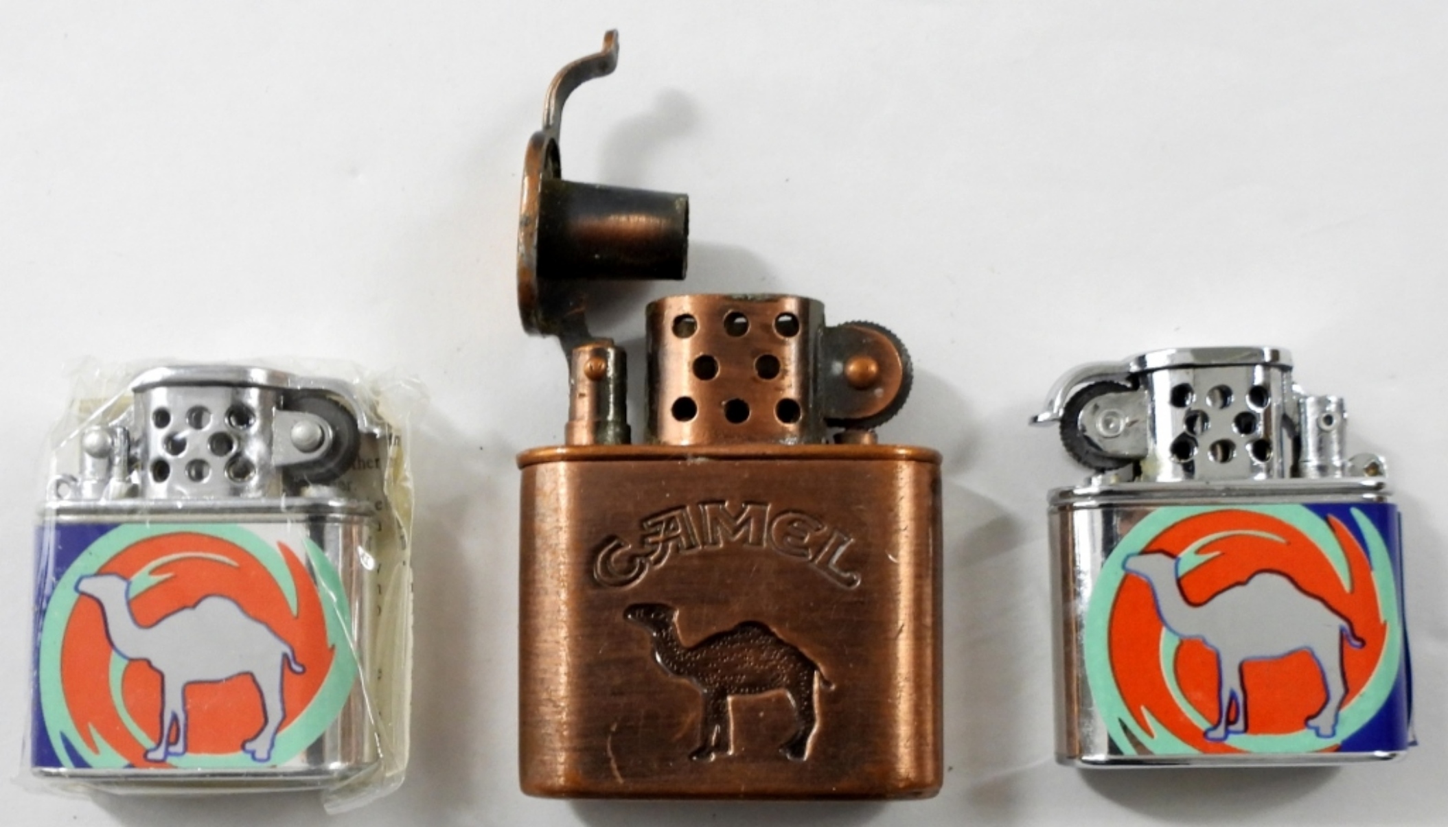 (3) CAMEL LIFT ARM LIGHTERS, (2) UNFIRED WITH COLORFUL CAMEL DESIGN AND 1 FIRED BRUSHED COOPED CAMEL DESIGN