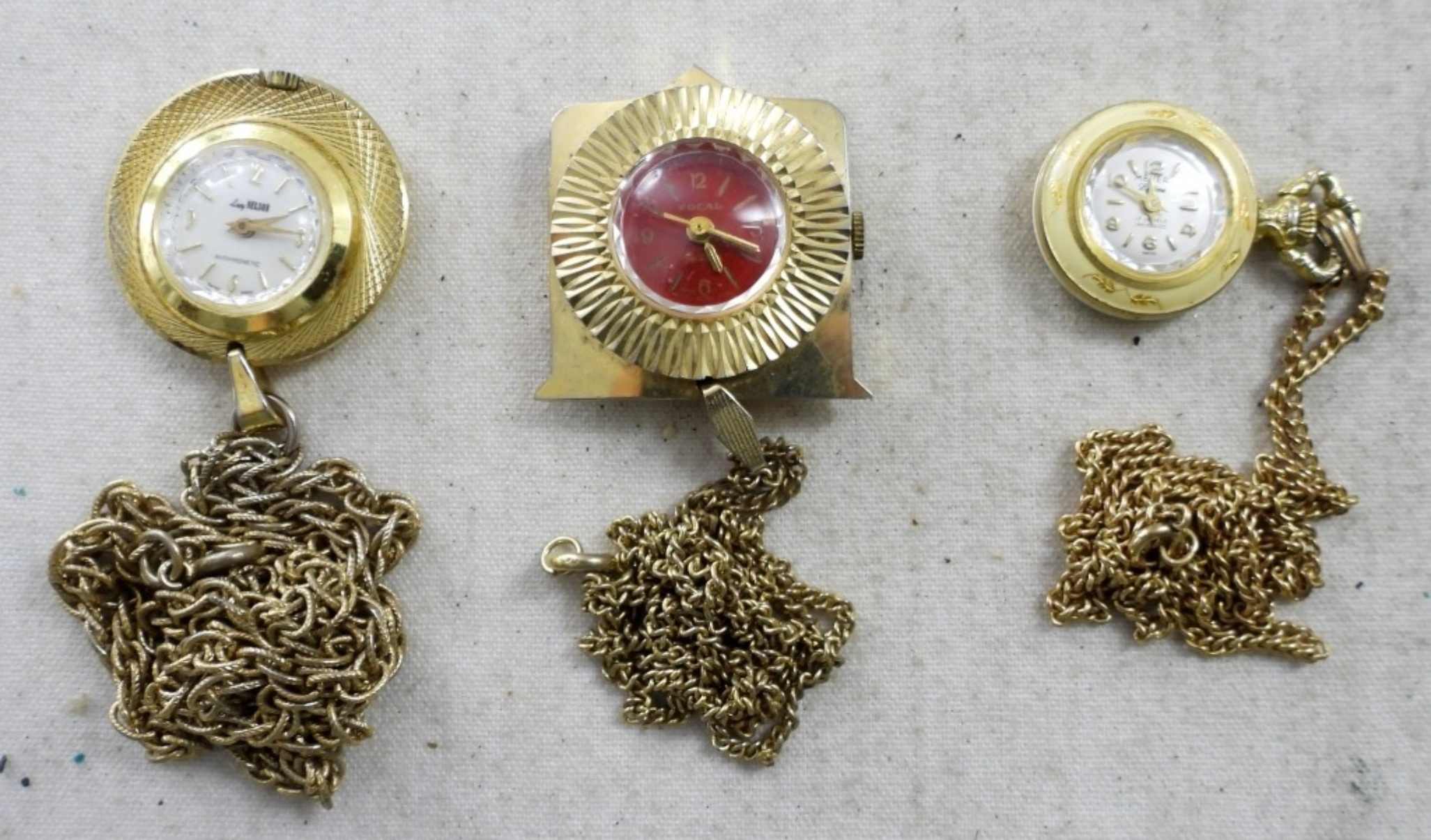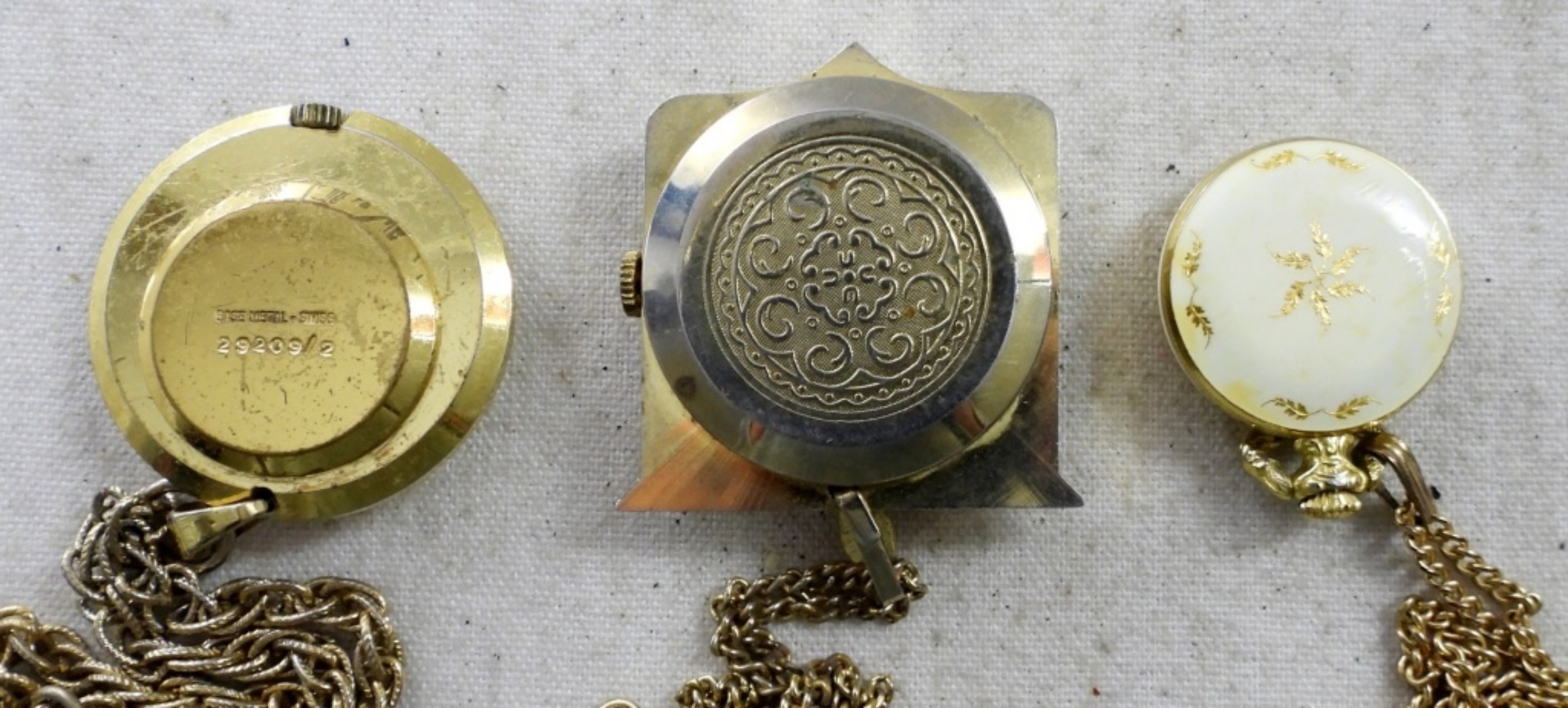 (3)LADIES PENDANT NECKLACE WATCH. GOLD TONE 24″ CHAIN (NOT TESTED AS TO WORKING OR NOT )