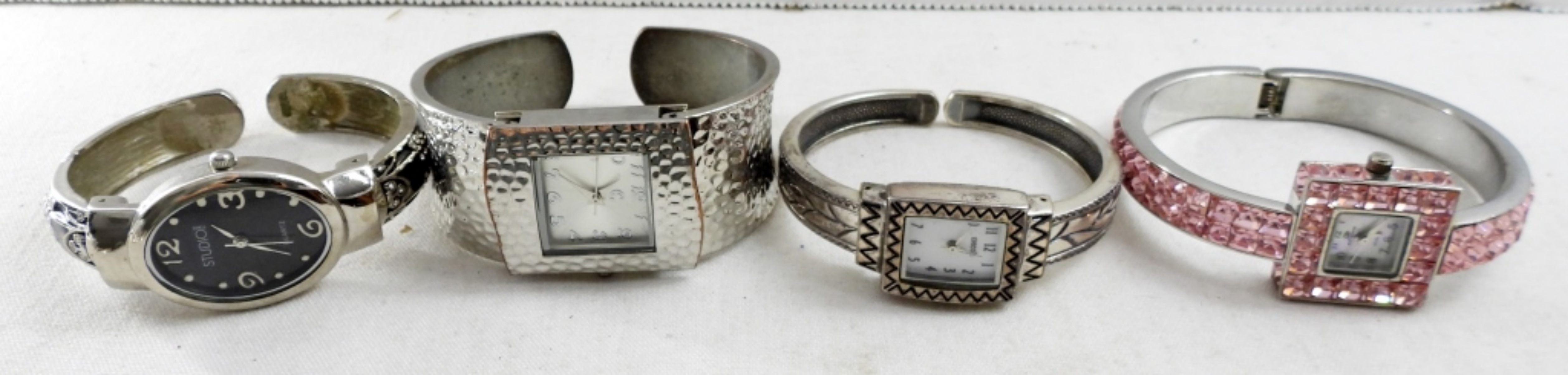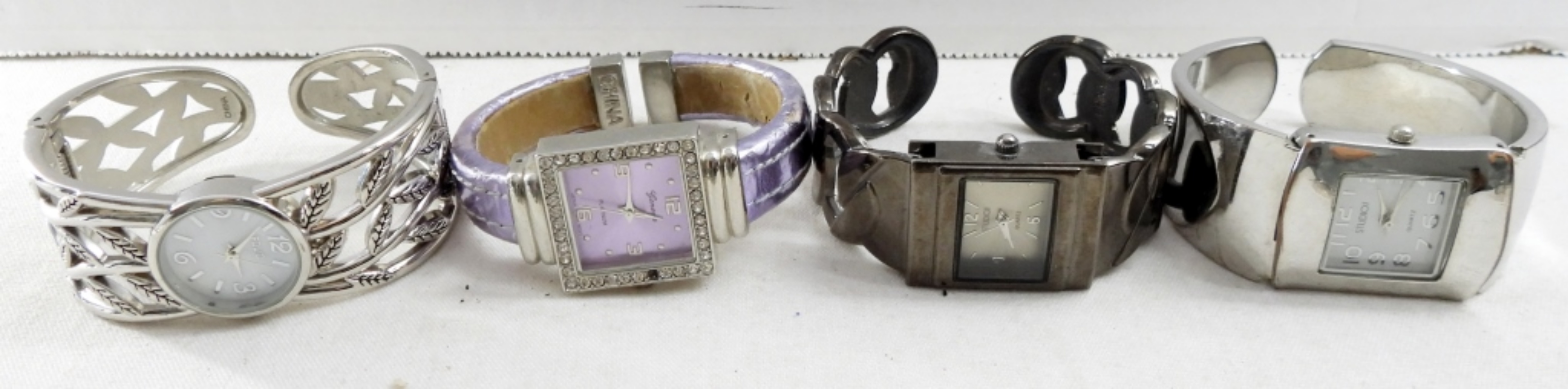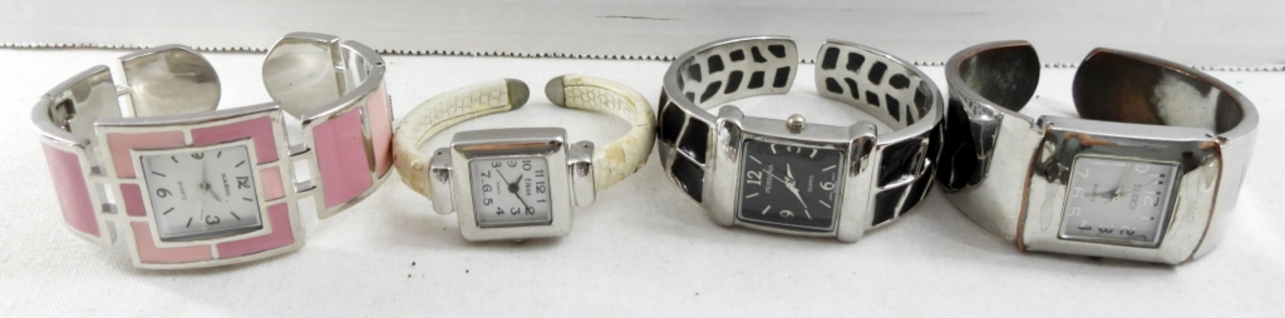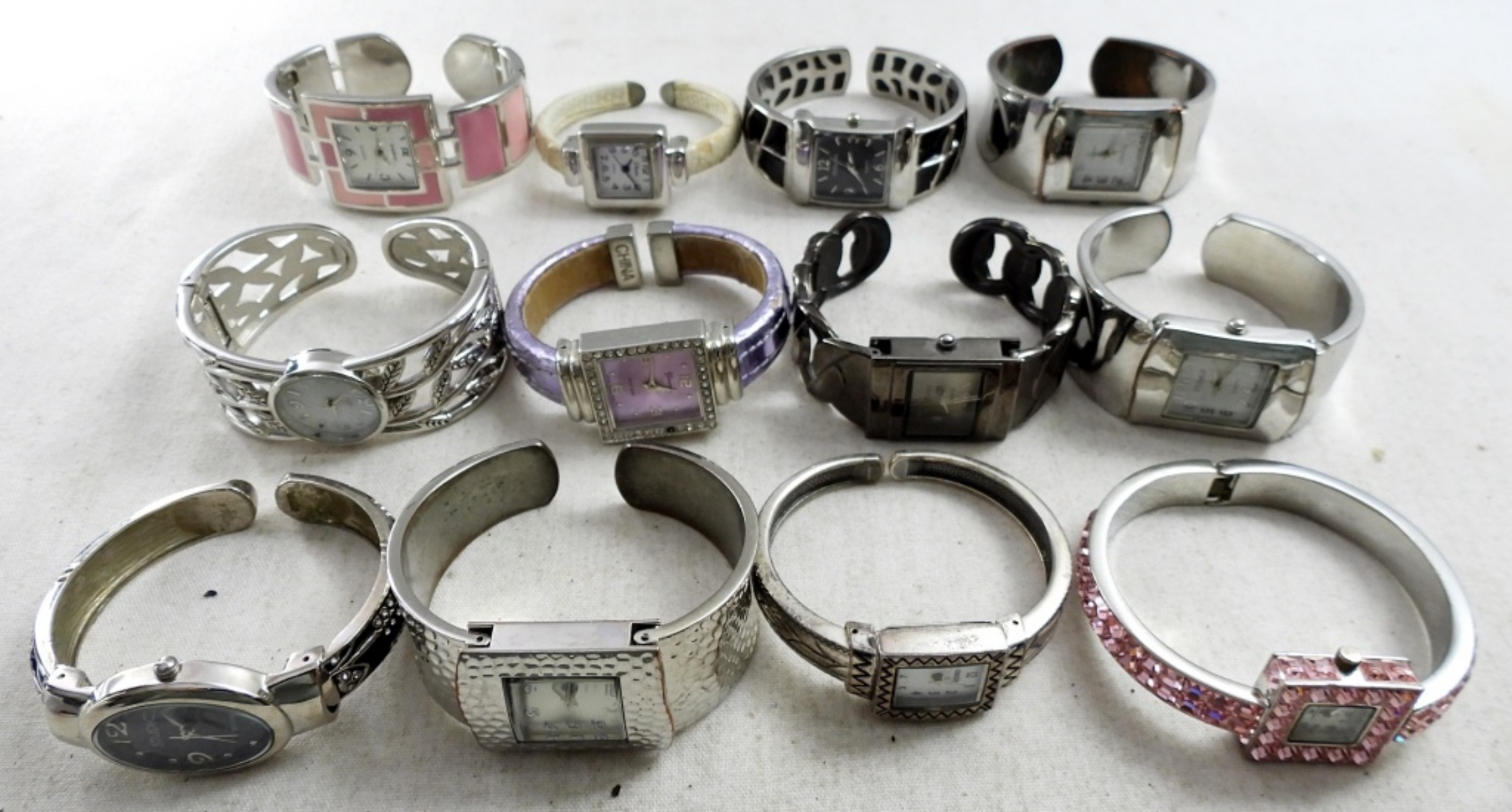 (12)LADIES SILVER TONE CUFF WATCH BRACELETS, PERSONA QUARTZ 7 MORE .(NOT TESTED AS TO WORKING OR NOT )