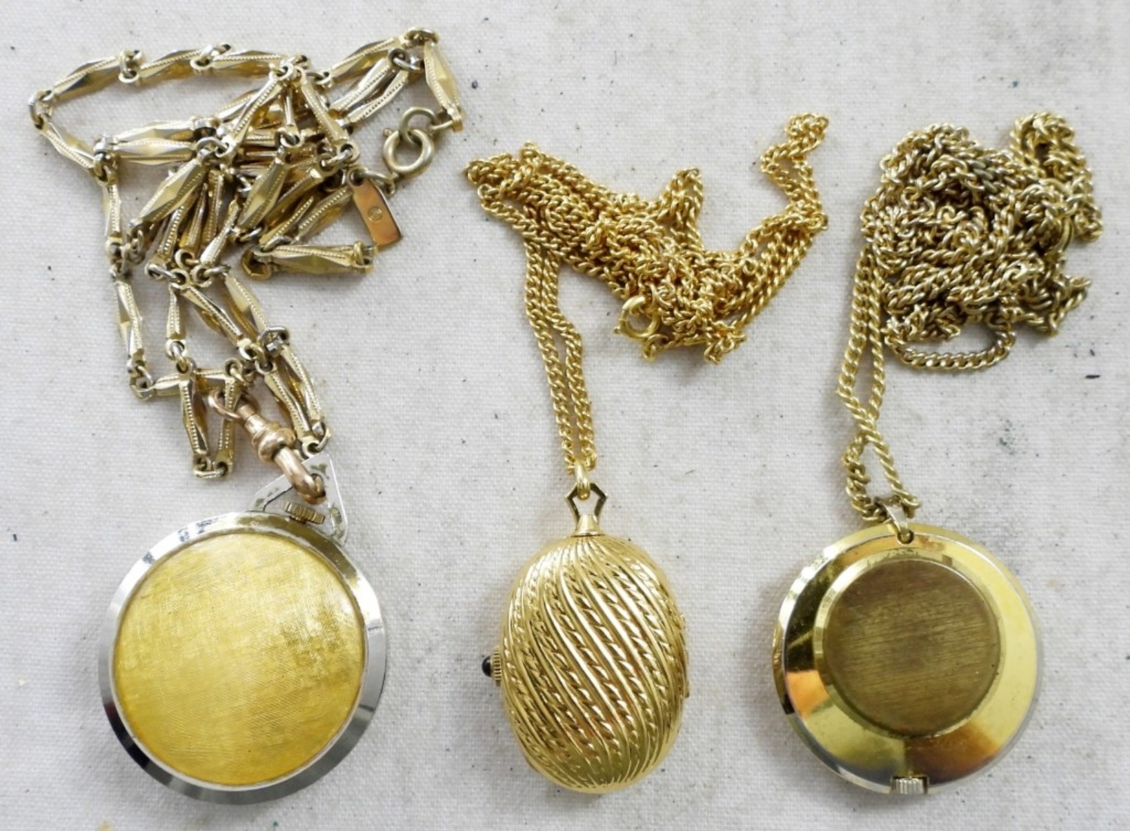 (3)LADIES GOLD TONE PENDANT NECKLACE WATCH,28″-32″ CHAINS ,MARDA, SHEFFIELD & MORE.(NOT TESTED AS TO WORKING OR NOT )