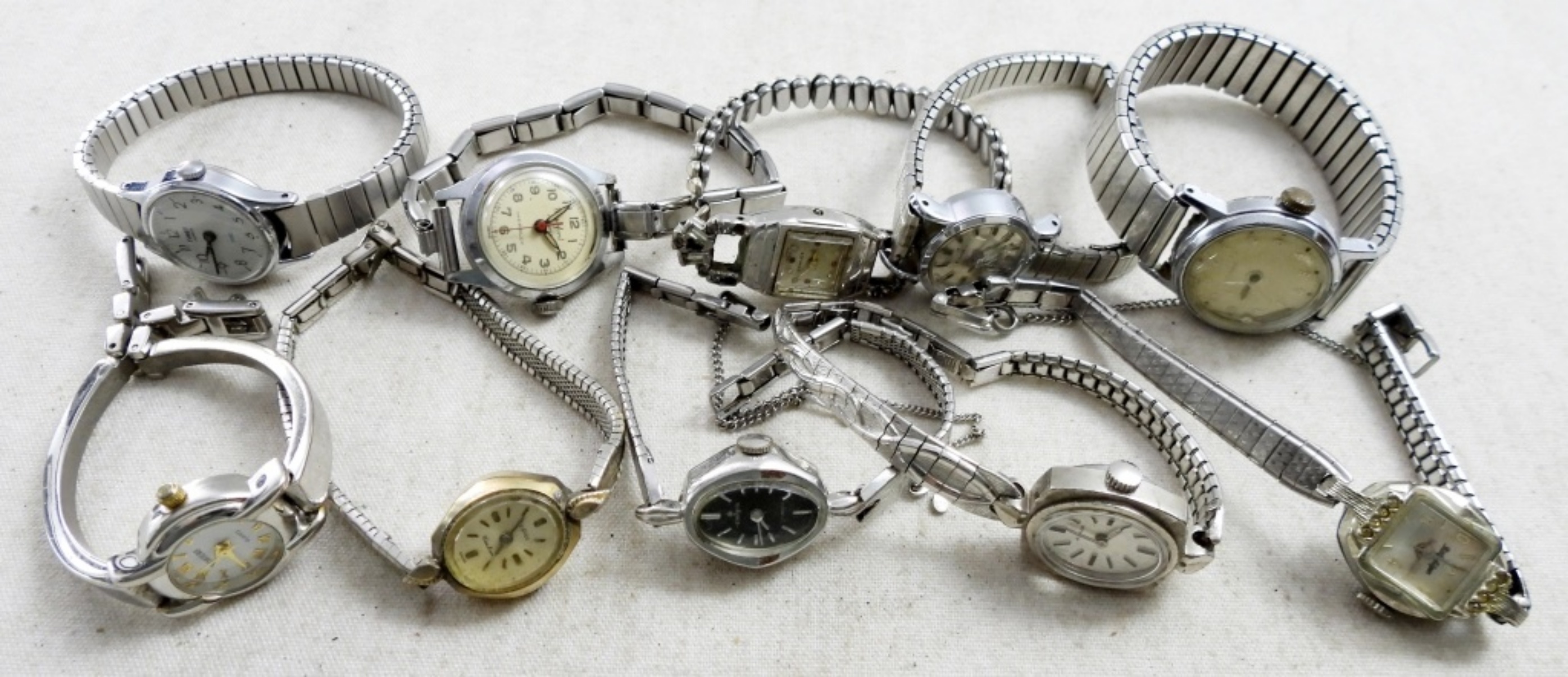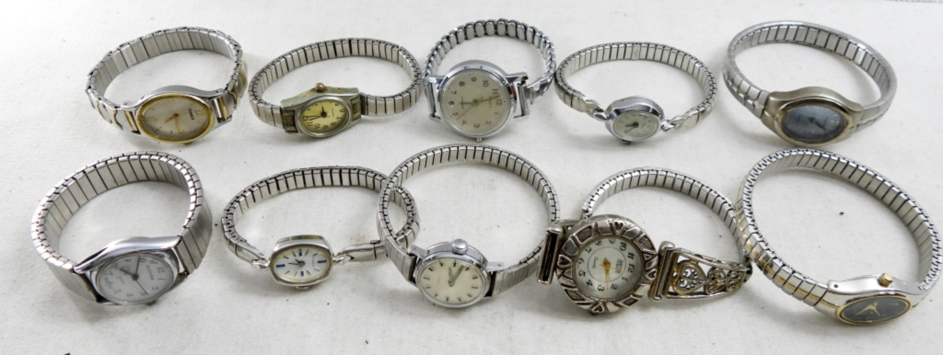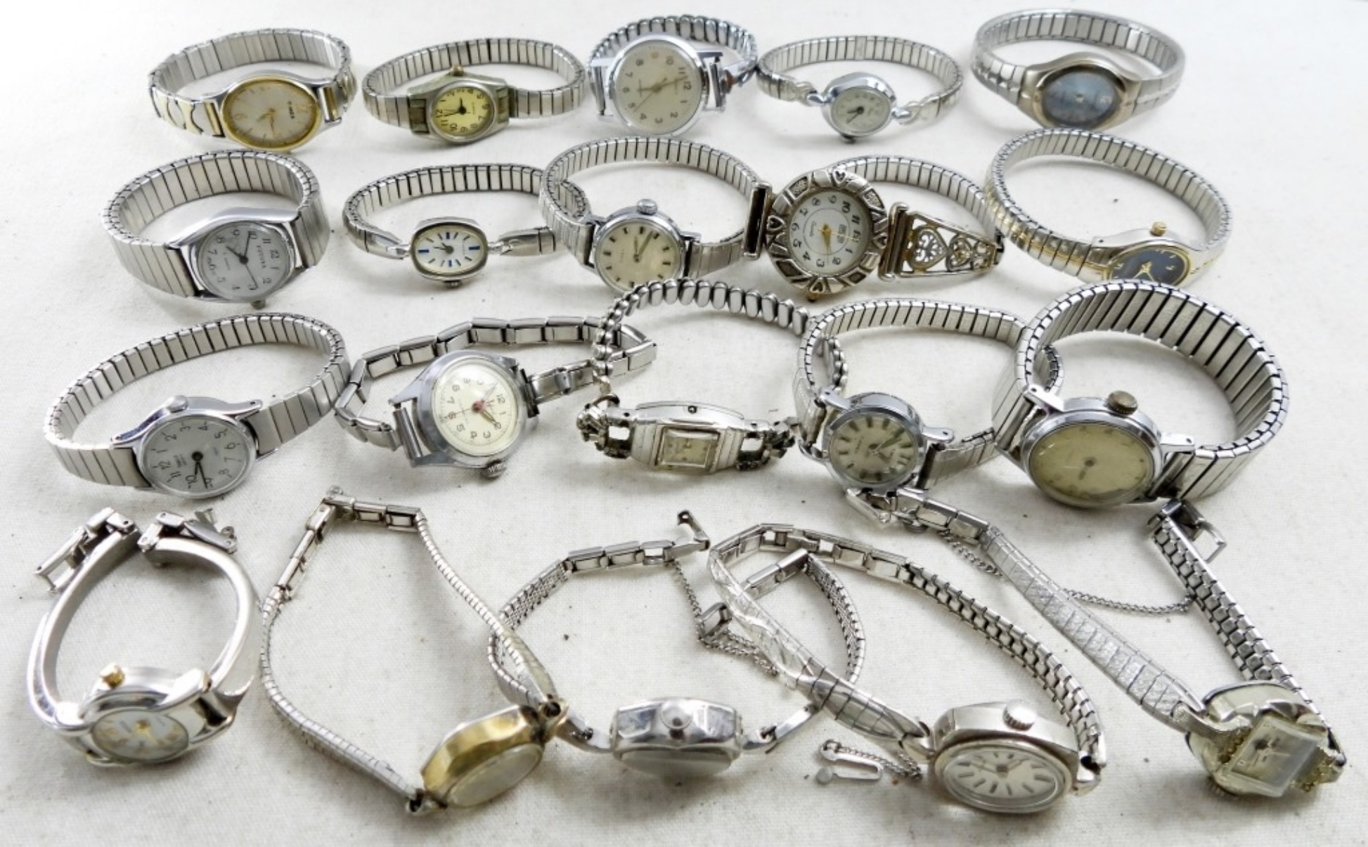(20) LADIES SILVER TONE WATCHES ,15 STRETCHY BANDS AND 5 CLASP BANDS, QUARTZ, TIMEX & MORE (NOT TESTED AS TO WORKING OR NOT )