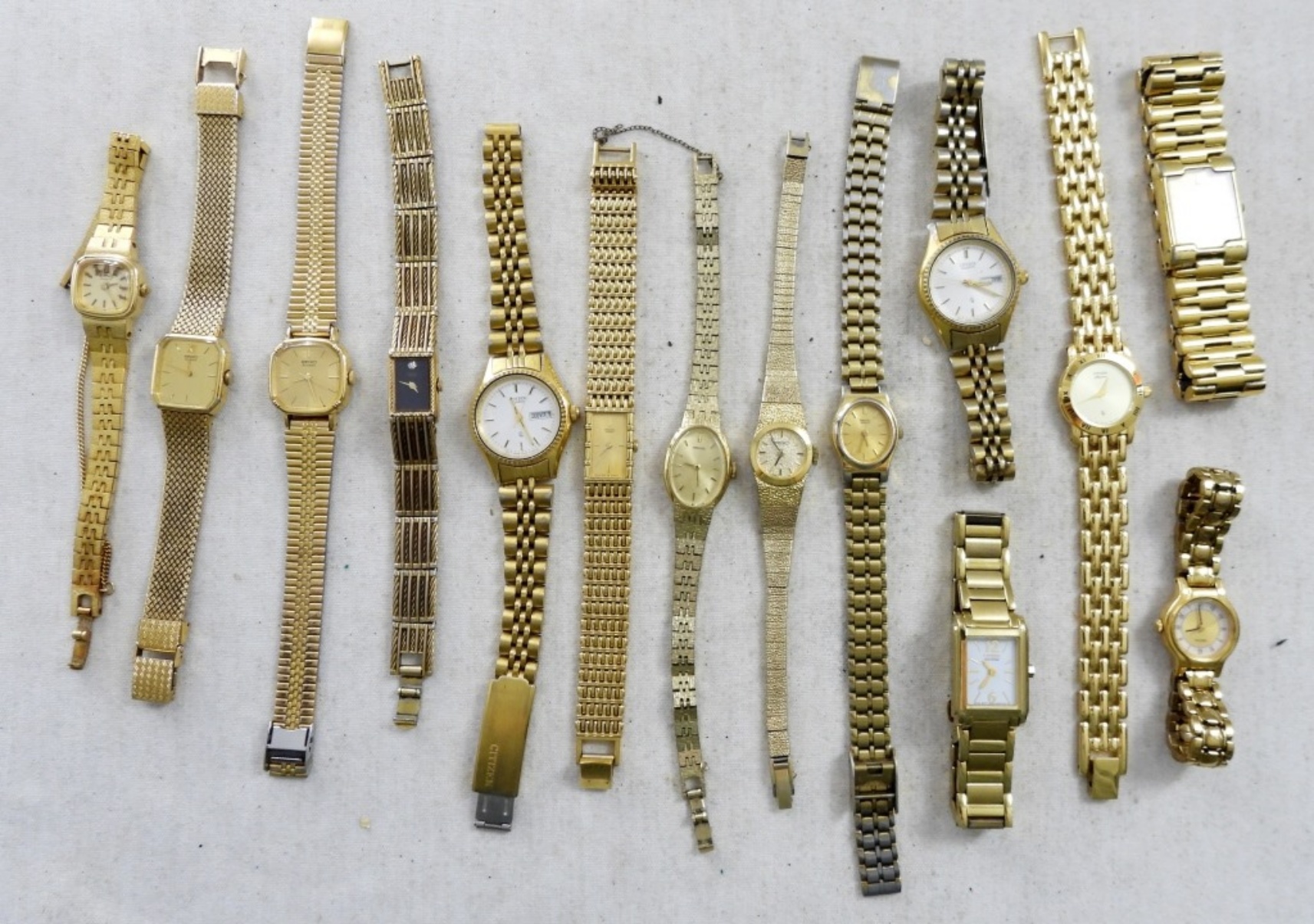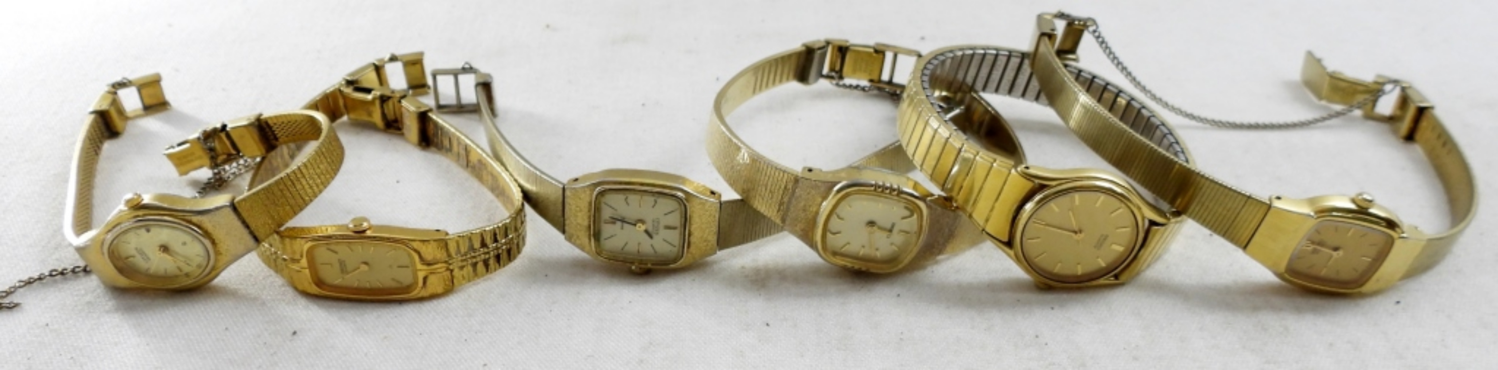 (20) LADIES GOLD TONE FASHION WATCHES ,ALL WITH CLASP BANDS , SEIKO, AND CITIZENS (NOT TESTED AS TO WORKING OR NOT )
