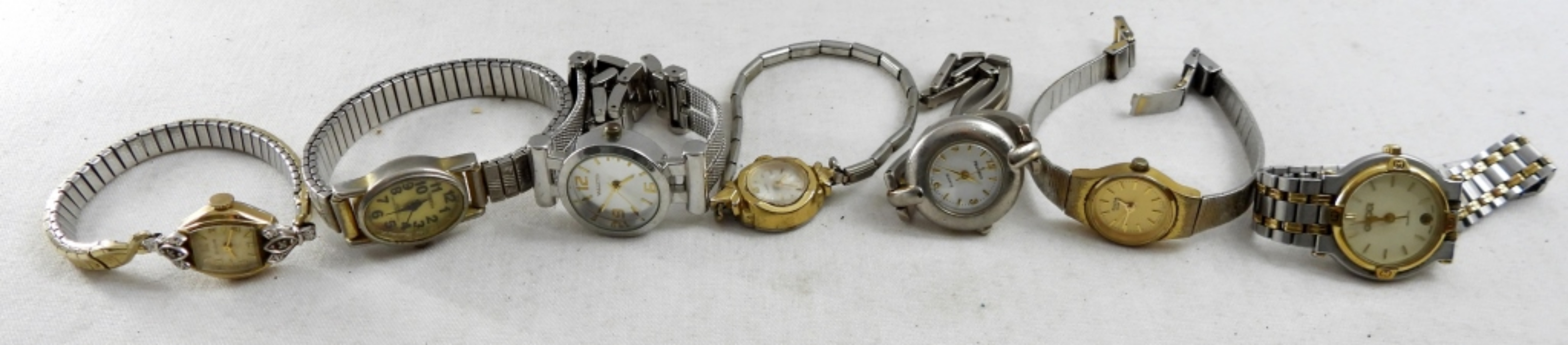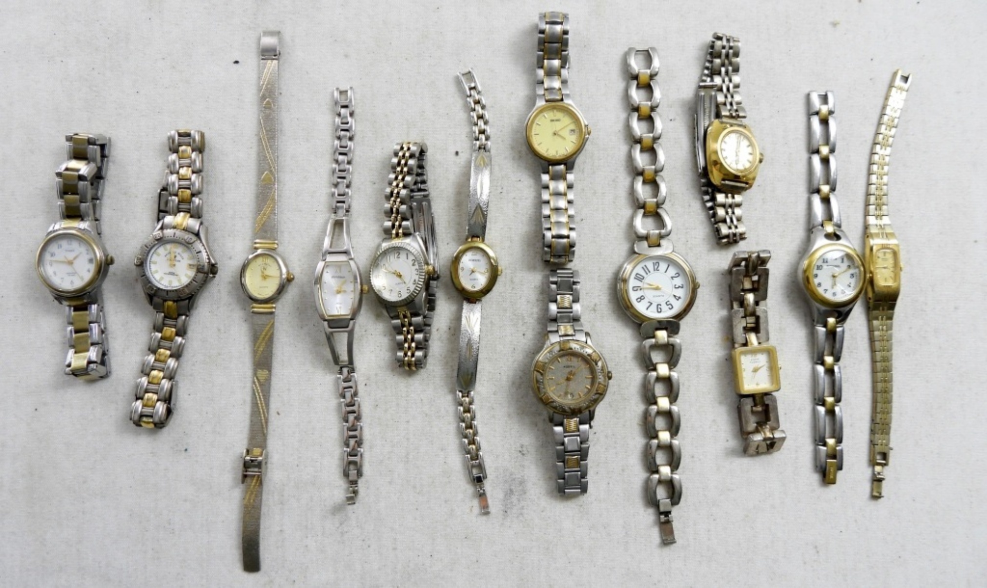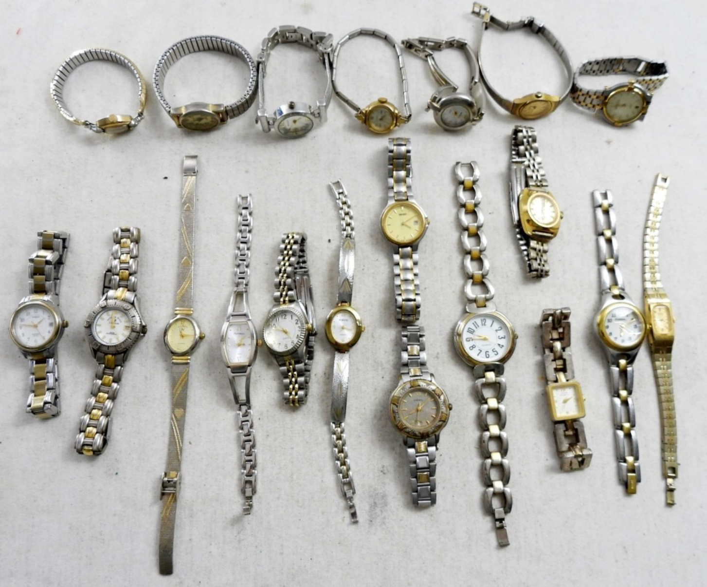 (20) 2 TONE LADIES FASHION WATCHES.QUARTZ, FOSSIL,BULOVA & MORE. STRETCHY AND CLASP BANDS (NOT TESTED AS TO WORKING OR NOT )