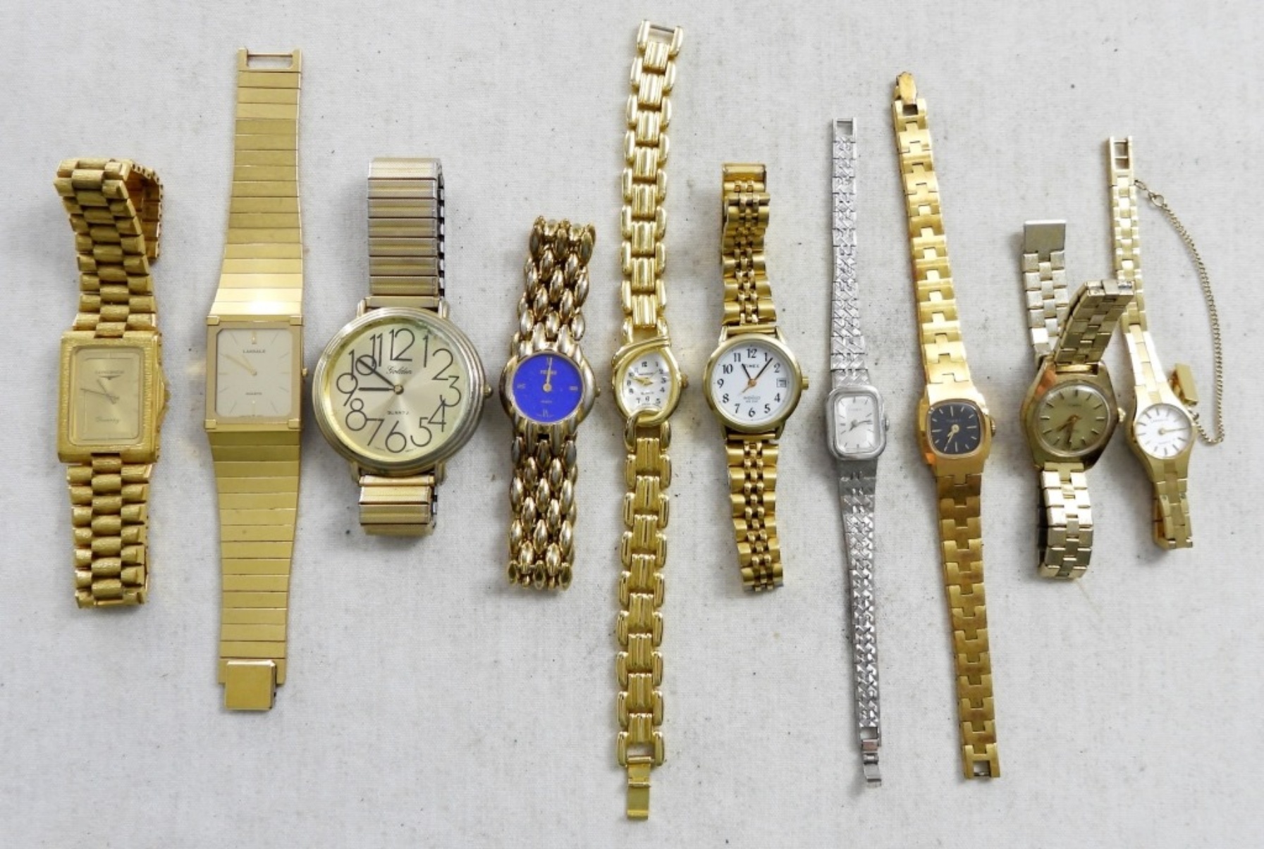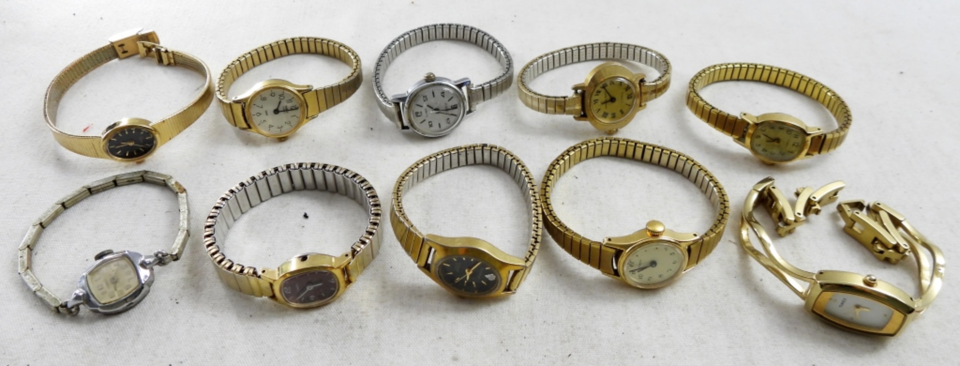 (20) LADIES GOLD TONE FASHION WATCHES , TIMEX AND QUARTZ (3) SILVER TONE (17) GOLD TONE . BOTH STRETCHY AND CLASP BANDS(NOT TESTED AS TO WORKING OR NOT )